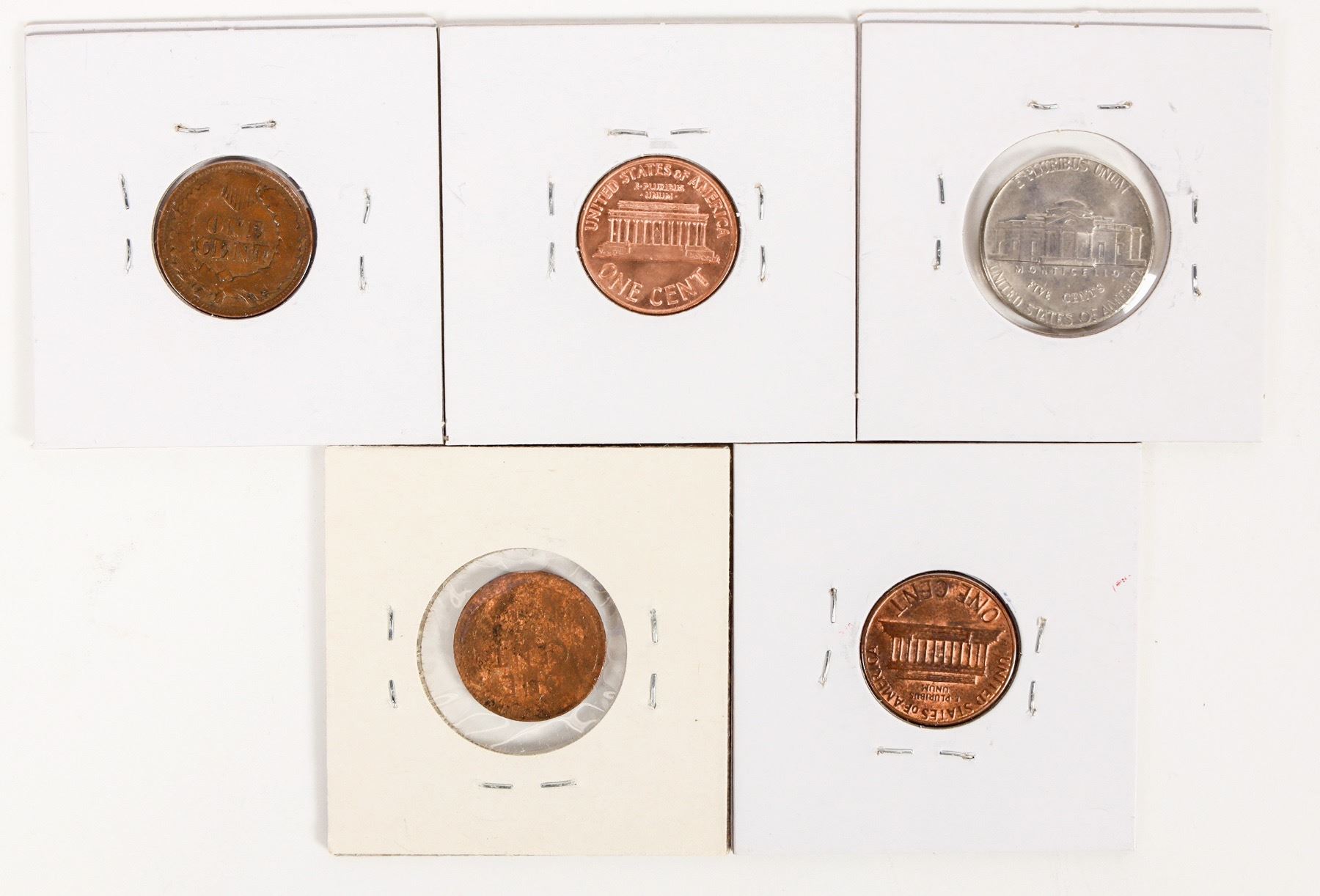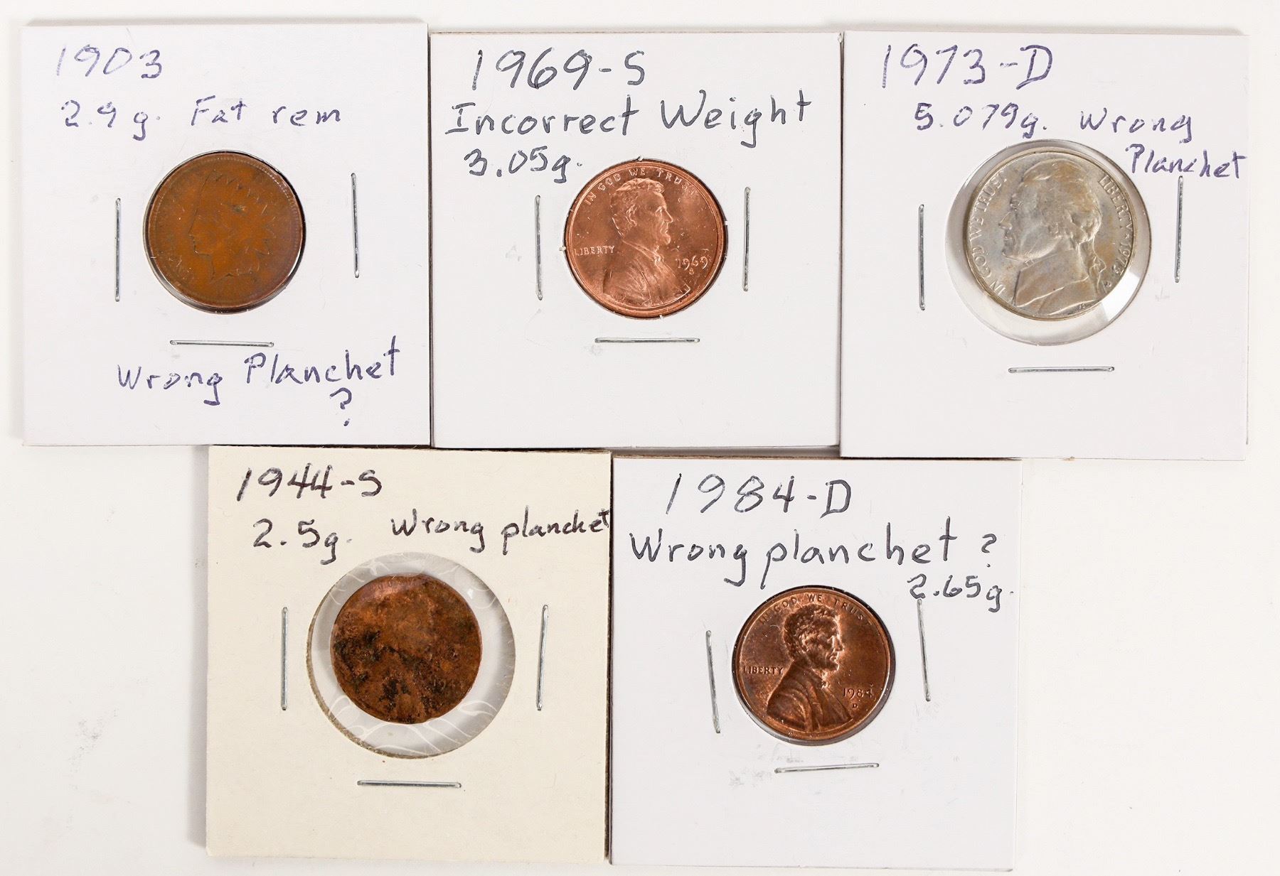 Three Lincoln cents, an Indian head cent and a Jefferson nickel that have wrong weights. (Who takes the time to weigh every penny?)