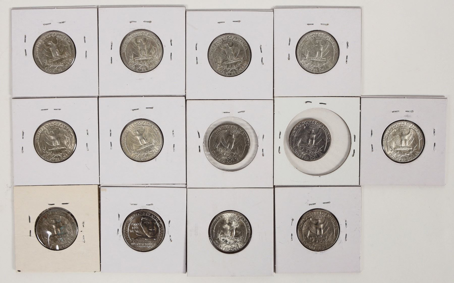 Thirteen Washington quarters attributed with errors. 1946-S over S in BU condition; seven 1964-D with doubled date or motto; five non silver coins with problems.