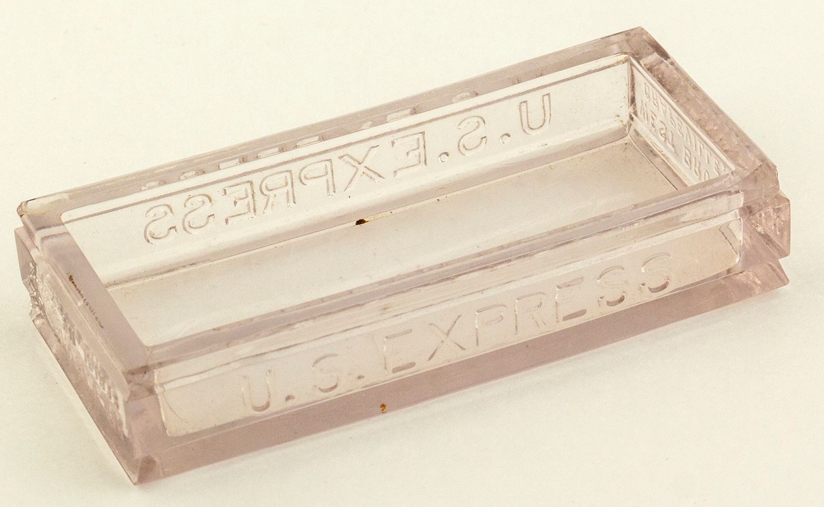 0.75 x 4.00 x 1.75". U. S. Express on both long sides. One small side says "Net Wt 1 1/4 oz / Serial No 2862." The other says "West Bro's Co / Grapeville. Pa." Westmoreland Glass Company was founded in 1889 when a group of men purchased the Specialty Glass Company located in East Liverpool, Ohio, and moved it to Grapeville, Pennsylvania. Grapeville was chosen as the location of the factory because the property had a large source of natural gas. George West served as president of the company, while his brother Charles West was the Vice President. Charles West is regarded as the "Father of the Candy Container Industry" for the company's extensive production of candy containers. West Brothers was a separate company which also produced the candy containers. Date: Location: HWAC# 47203