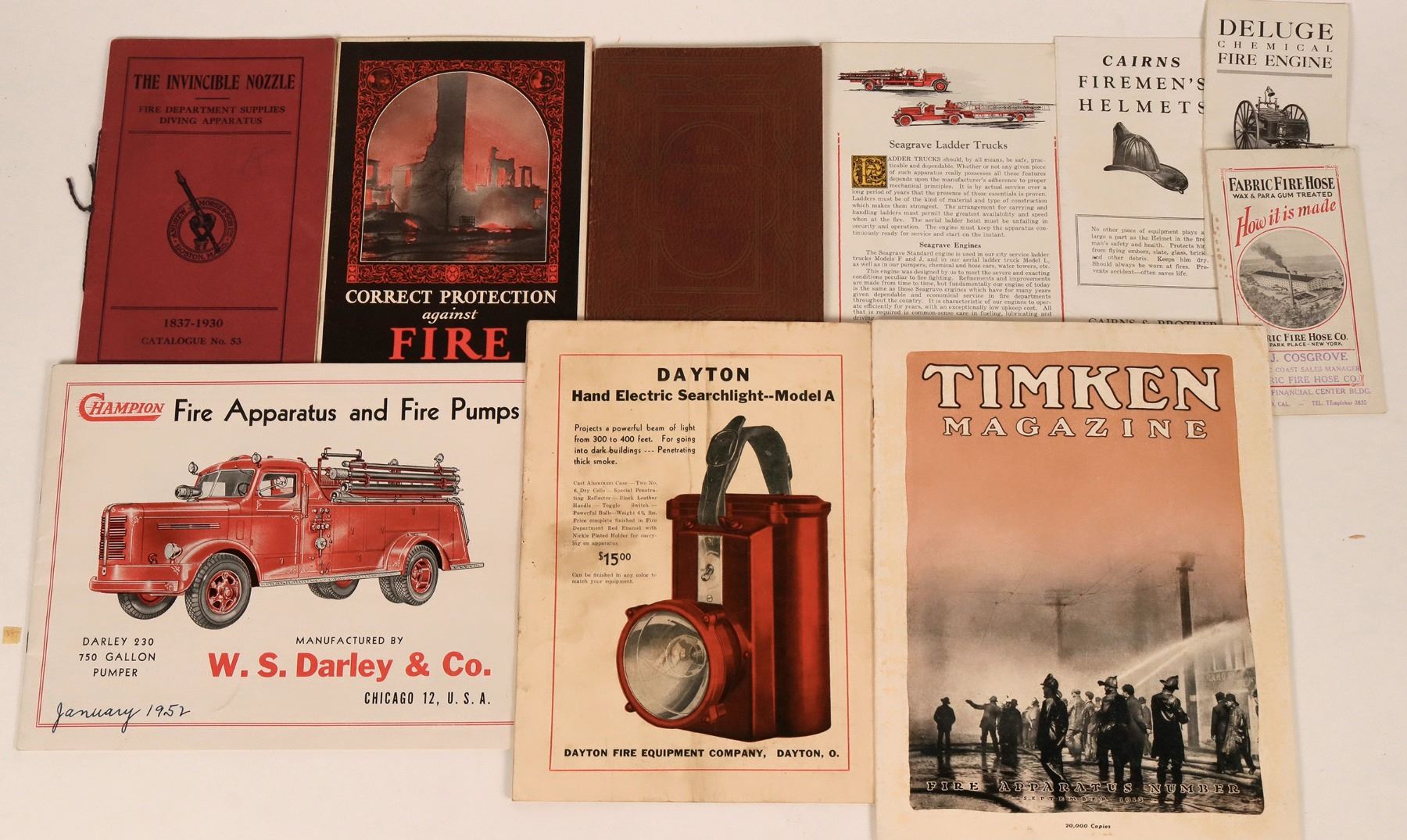 Incredible Lot of 10 Fire Department Supply catalogs, brochures and related publications; covers equipment, supplies, apparatus, pumps, hoses, safety/protective items, chemicals, engines and more, from across the United States; published by major manufacturers. Excellent, comprehensive 20th century Firefighting reference lot. 1) Correct Protection Against Fire, Foamite - Child's Corp's Fire Extinquisher 1927 Catalog. 25 pages with color. Softbound. 2) The Invincible Nozzle, A.J. Morse & Son 1930 Catalog for Fire Department. Supplies & Diving Apparatus. 38 pages, well illustrated with fire boats and other apparatus. 3) Fire Prevention & Protection, A.C. Rowe & Son, N.Y. Firefighting & Prevention Appliances and Safety Devices Catalog. 128 pages profusely illustrated 4) Deluge Chemical Fire Engine Sales Brochure 5) Seagrave Ladder Trucks colorful tri-fold brochure circa 1930 6) Fabric Air Hose Co. New York 12 page "How it is made" brochure 7) Cairns & Brother Co. New York Firemen's Helmets 6 page brochure, 1933 8) Champion Fire Apparatus & Fire Pumps, 1952, multiple models illustrated, 43 pages 9) Dayton Fire Equipment, Ohio, 1952 Catalog No. 33, 30 pages 10) Tinker Roller Bearing Co. Canton, Ohio 1913 Fire Apparatus Catalog (Classic color illustrations, 24 pages.