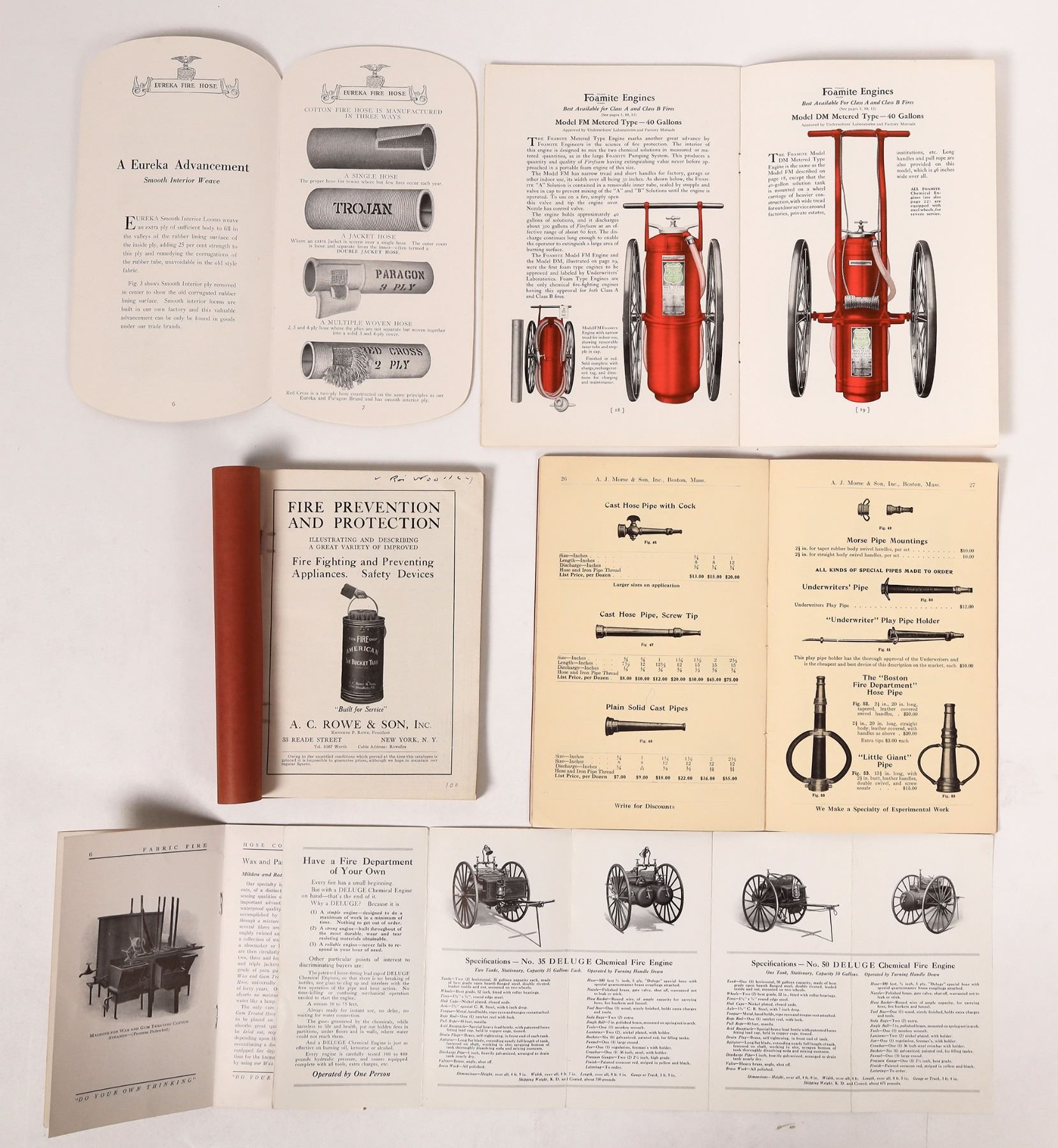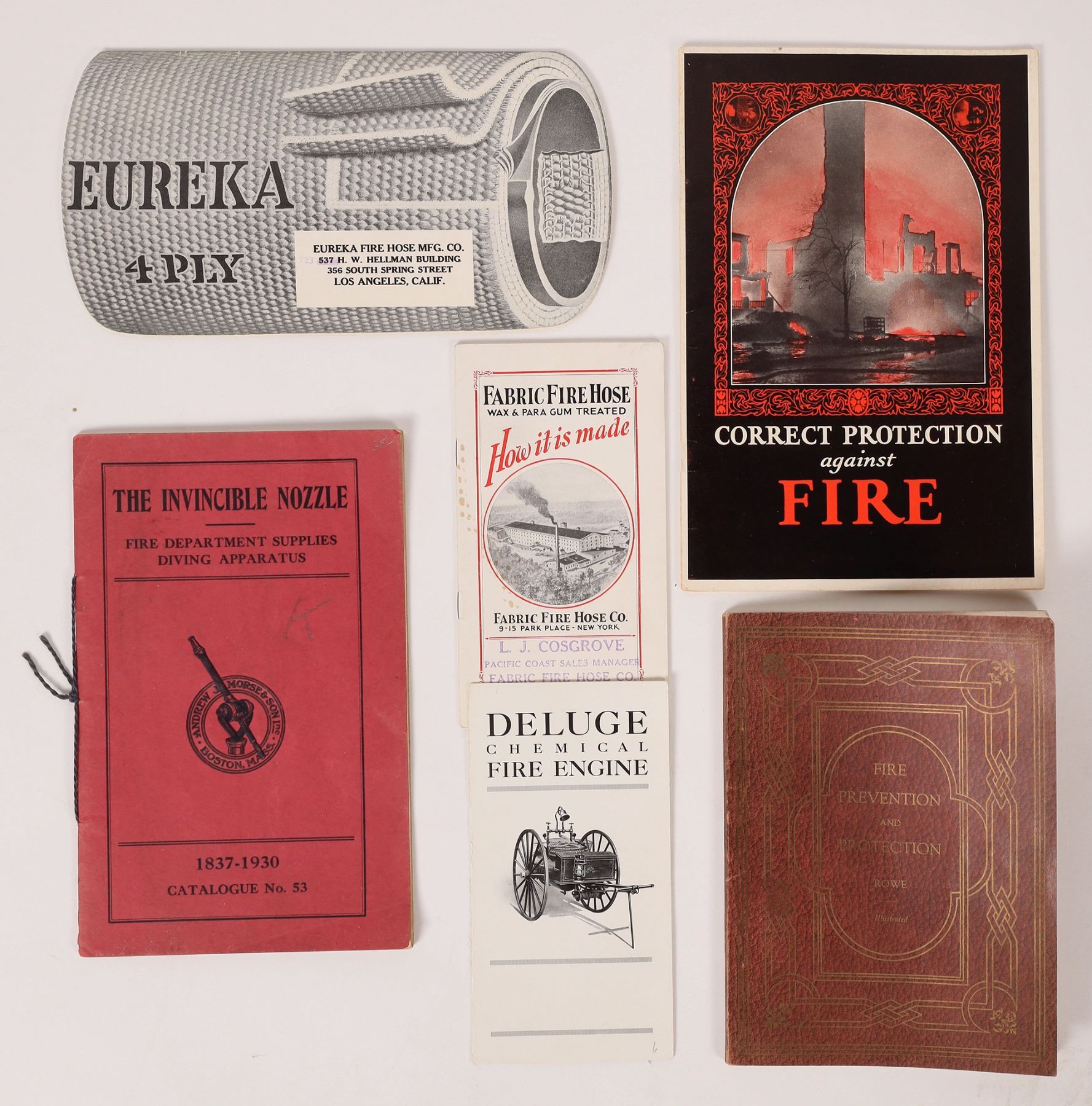 U.S. Fire Dept. Prevention & Protection Products (6). 1) "Fabric Fire Hose Co.", N.Y., promotional booklet describing with illustrations just why their product is superior to others. (3-1/2" x 6-1/4", 12 pages). 2) "Deluge Chemical Fire Engine". Sales brochure shows illus. of 7 different models and their specifications (4-fold 3-1/4 x 6-1/4"). 3) "Eureka Fire Hose Mfg. Co.", N.Y. Cleverly design-ed & illus. catalog displaying advanced fire hose, couplings & other fire suppression products. (9 x 5", 20 pgs.). 4) "Fire Prevention & Protection", A.C. Rowe & Son, N.Y. Firefighting & Prevention Appliances & Safety Devices Catalog, 1918. Profusely illus. 7-1/2" x 5-1/4" SC, 128 pg.). 5) "The Invincible Nozzle", Andrew J. Morse & Son, Inc., Boston, Mass., Fire Dept. Supplies & Diving Apparatus, 1930. (5-1/2" x 8-1/2" SC, 38 pages). 6) "Correct Protection Against Fire", Foamite-Childs Corp., 1927. Colorful catalog discussing fire suppression and displaying their equipment to accomplish it. (6" x 9" brochure, 25 pages).