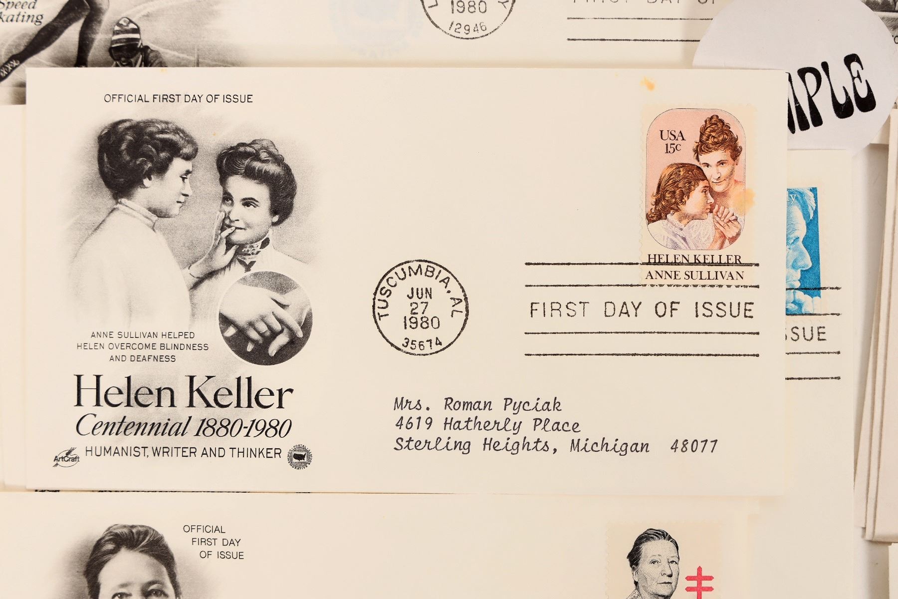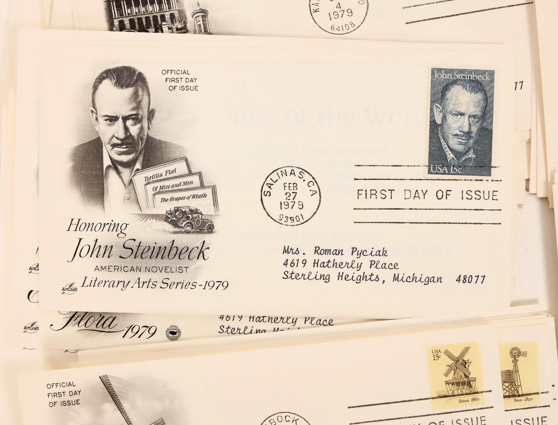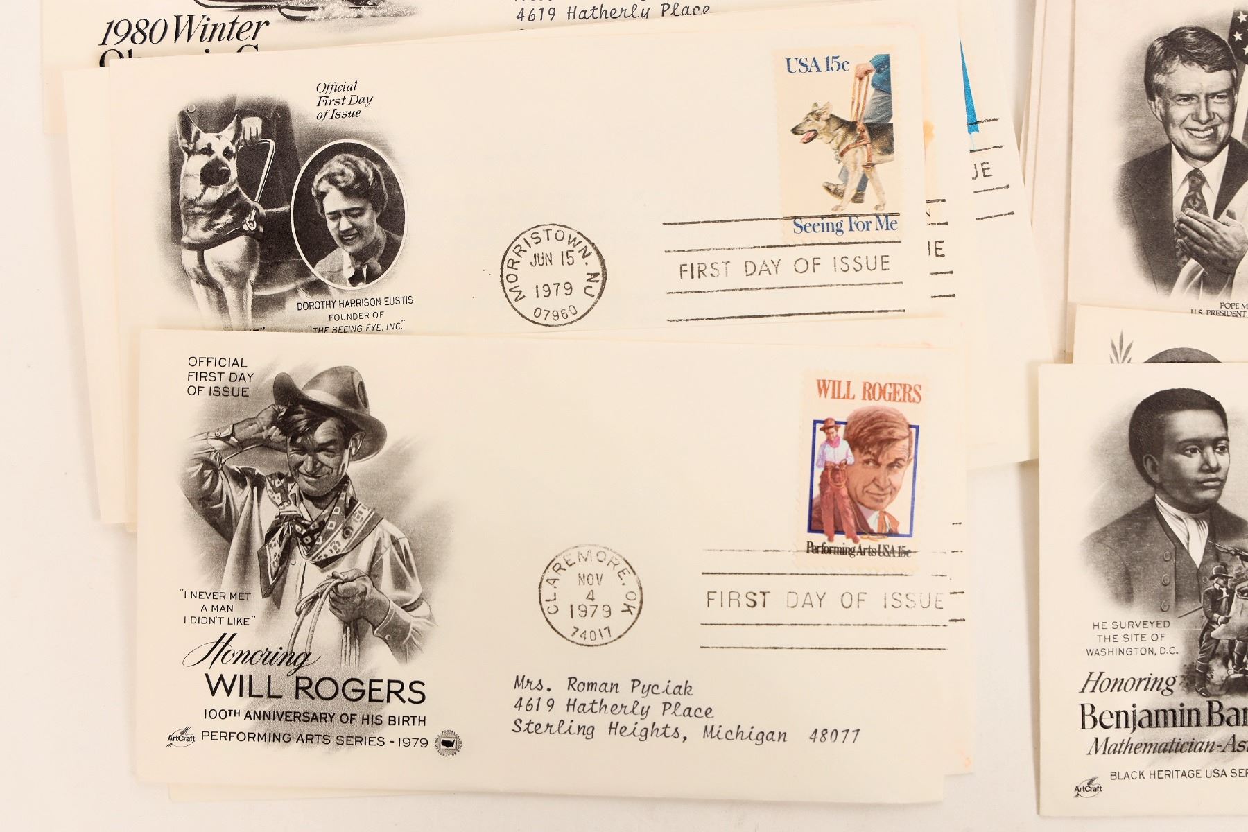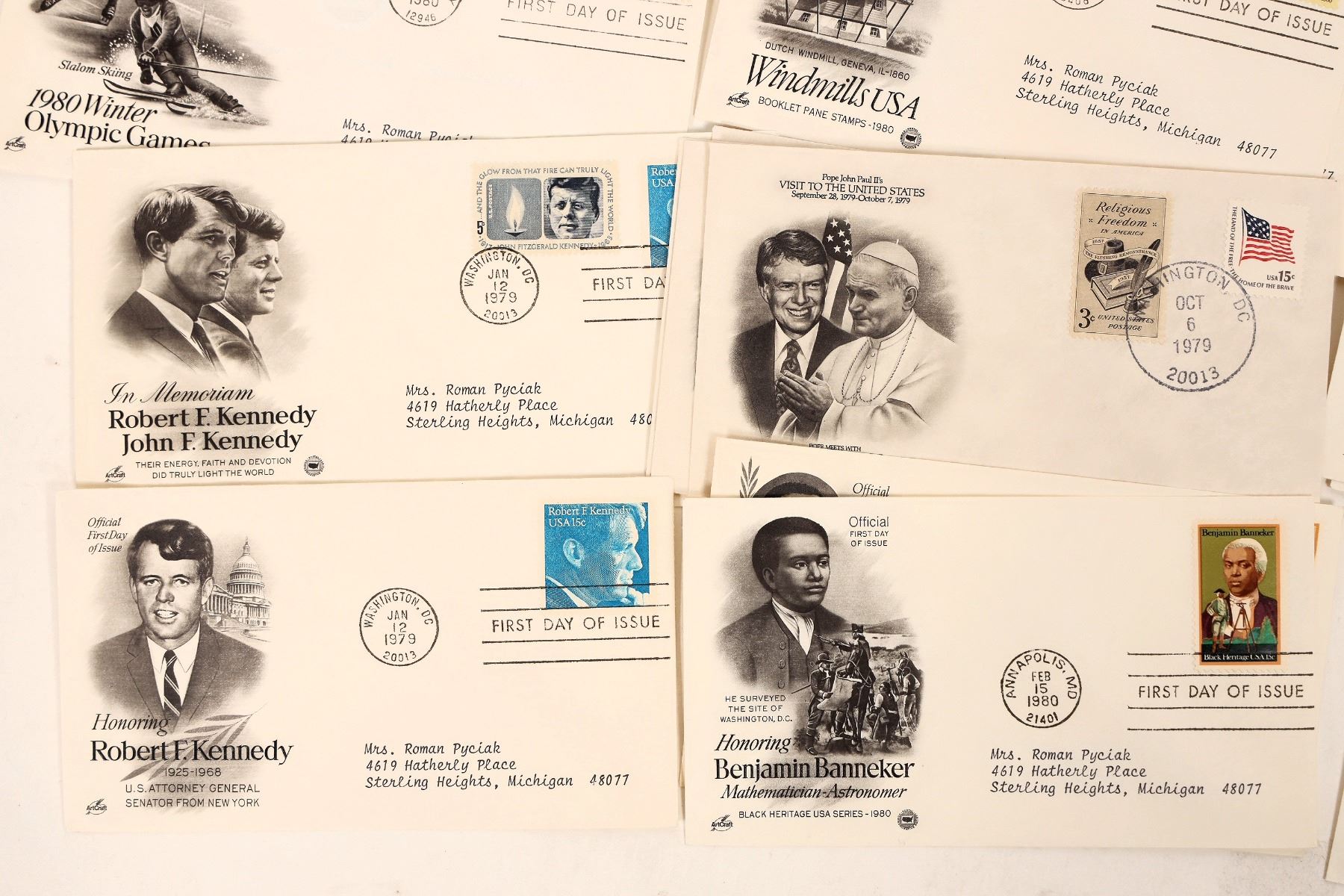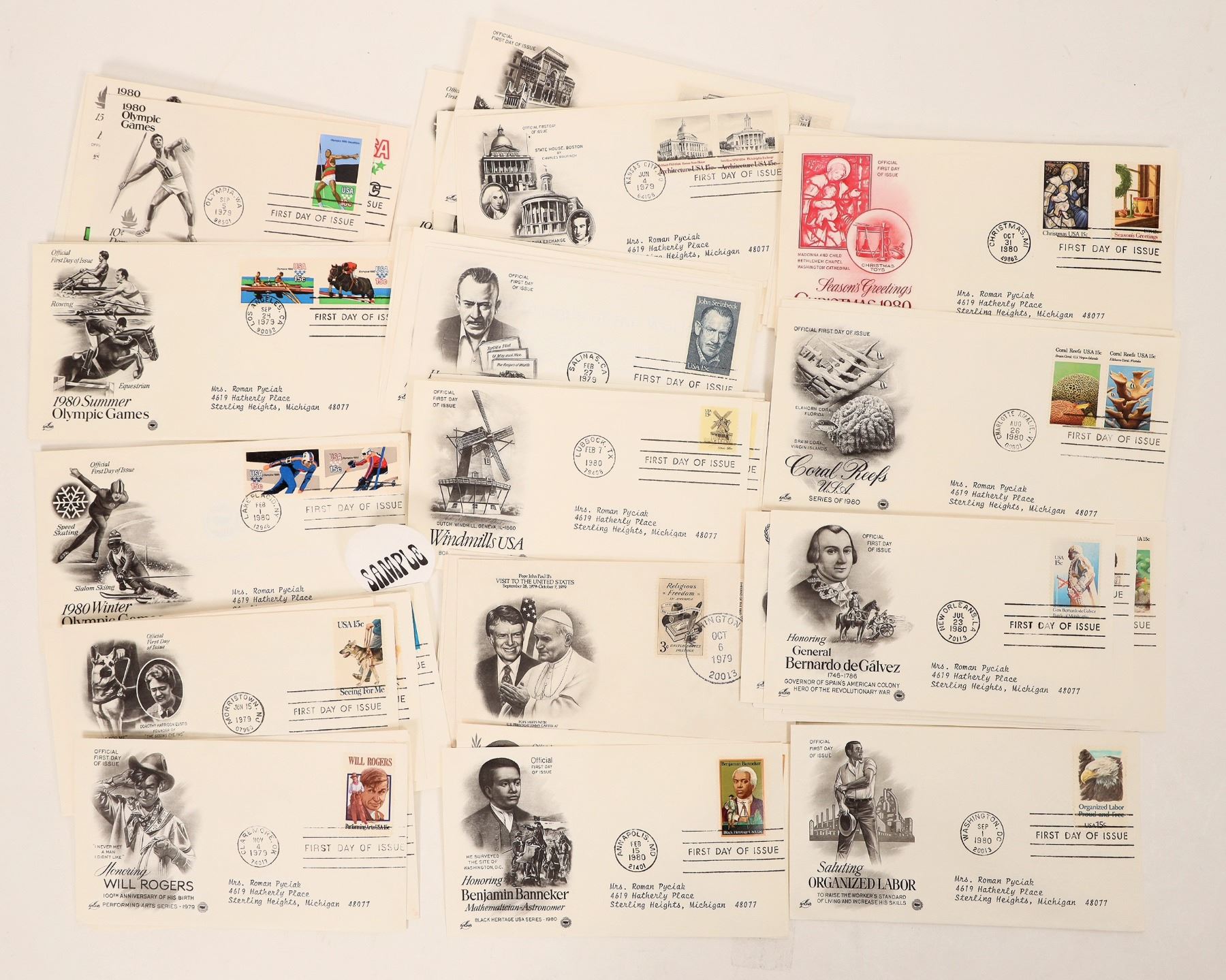 Collection of 54 first day covers issued in 1979 & 1980 with United States commemorative stamps. Pope John Paul's White House visit; 1980 Winter Olympics at Lake Placid; Dolly Madison miniature postage stamps and many others. [