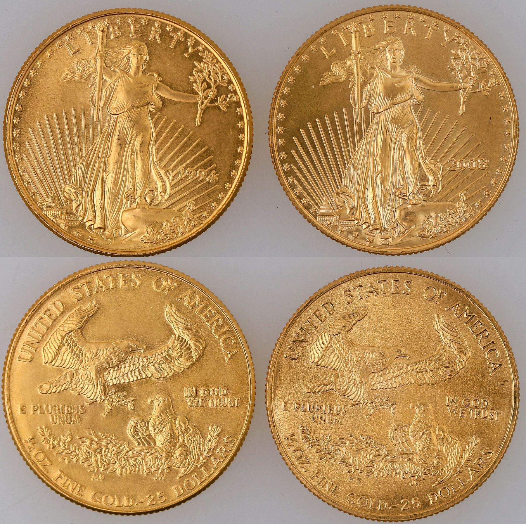 Two mint state $25 gold eagles, each one half ounce of fine gold.