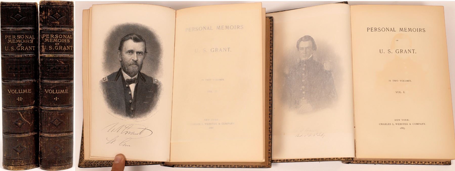Personal Memoirs of US Grant, 2 vols, Webster & Co, NY, 1885. Dark brown leather bindings in very fine condition, medallic impression of bust of Grant on front covers. not x-library. Considered the best refence of Grant, written in his own words, encouraged by none other than Sam Clemens (see his autobiography). This is not a duplicate of lot 2133.
