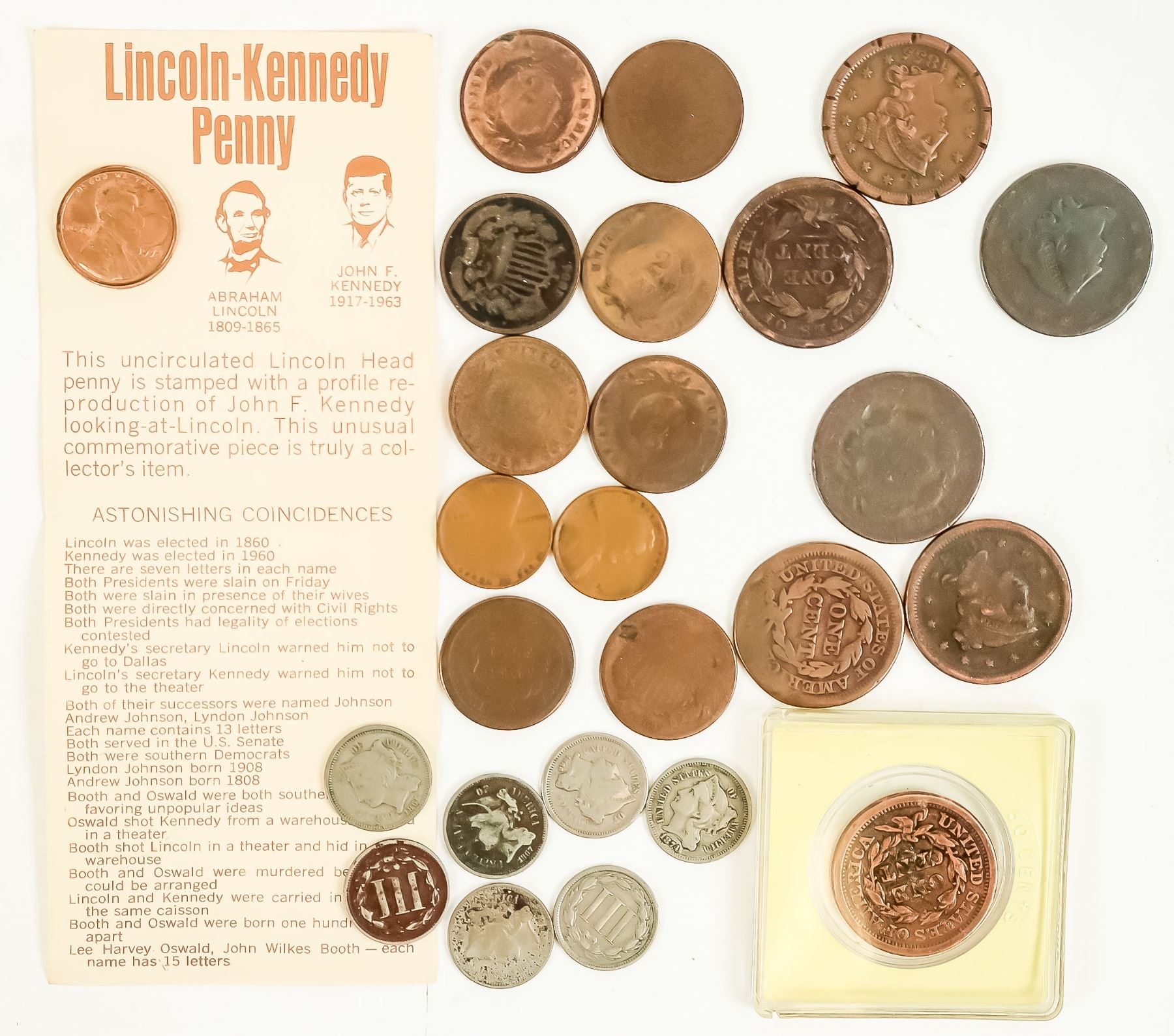 Nice lot of small denomination U. S. coinage: 1851 half cent (G); seven large cents: 1838, 1851, 1853 (2), 1855, two unreadable dates (AG-VG); two 1909 Lincoln pennies (G-VG); 1973-D Lincoln cent counter stamped with JFK with a card of similarities; seven two cent pieces: 1864 (4); 1866; two unreadable dates (AG-G); seven three cent pieces: 1865 (2); 1866 (2); 1867; 1868; 1874 (AG-VG).