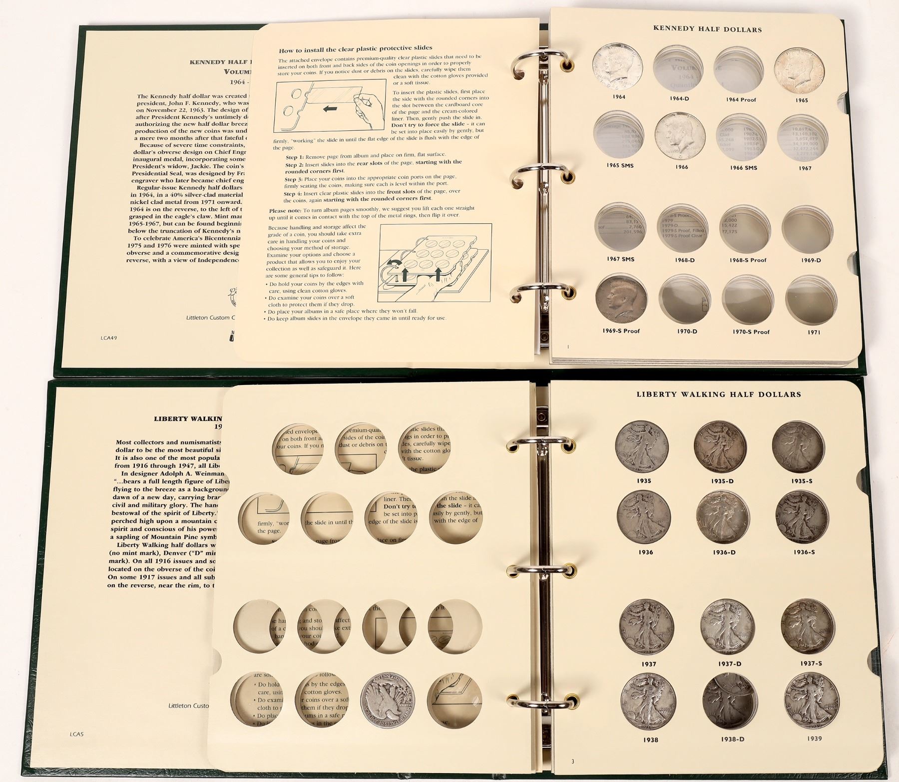 Two elegant Littleton Custom Coin Albums (8 x 9 inches); 1) Liberty Walking Half Dollars 1916-1947; with 26 coins, the earliest is 1934. 2) Kennedy Half Dollars 1964-1987 with four coins: 1964, 1965, 1966 and 1776-1976.