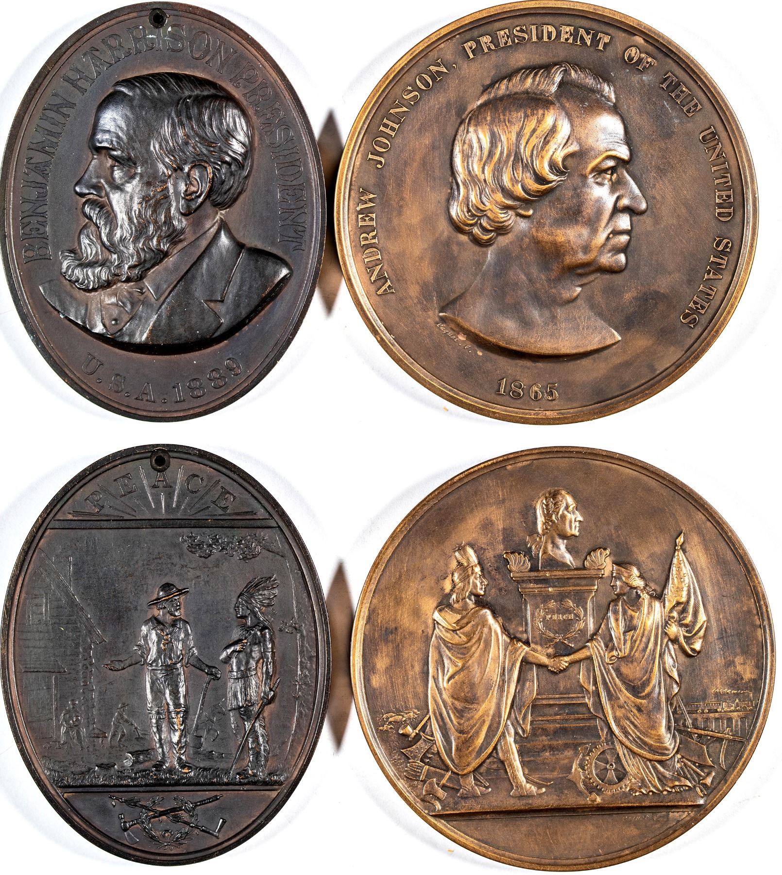 (1) 1865: Post 1900 restrike of the Andrew Johnson large sized Indian Peace Medal. The medal has been artificial toned outside mint. Bronze, 76mm, Unc. Est. $50-$100 (2) 1889: Bronze U.S. Mint Benjamin Harrison Indian Peace medal. No medals were ever issued for use as Peace medals. All were struck for collectors. The presence of a hole indicates that this piece was modified outside the mint in an attempt to suggest it had been struck for use as a Peace medal. It was not, although it is an earlier strike. Bronze, 60 x 76mm, Unc