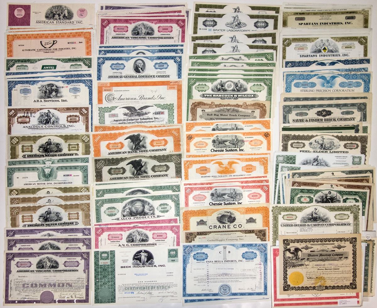 Group of approx. 160 stock certificates from dozens of U.S. Industrial Companies. Most issued between the early 1950's and the 1970's. All are cxled. Some notables include: American Standard, Automatic Cafeterias for Industry, Inc., ARA Services, American Meter Co., Am. Viscose Corp., American Banknote, Babcock & Wilcox, Baxter Laboratories, Chessie System, Casa Bella Imports, Perfect Photo, Inc., Perfect Film & Chemical, Phoenix Glass Co., Sayre & Fisher Brick Co., Terex Corp., United Board & Carton Corp., Sterling Precision and Spartan Industries. Some have multiple duplicates, some there are only one. Condition mostly VG to F. City: State: United States Date: 1950-79 hwac# 25671