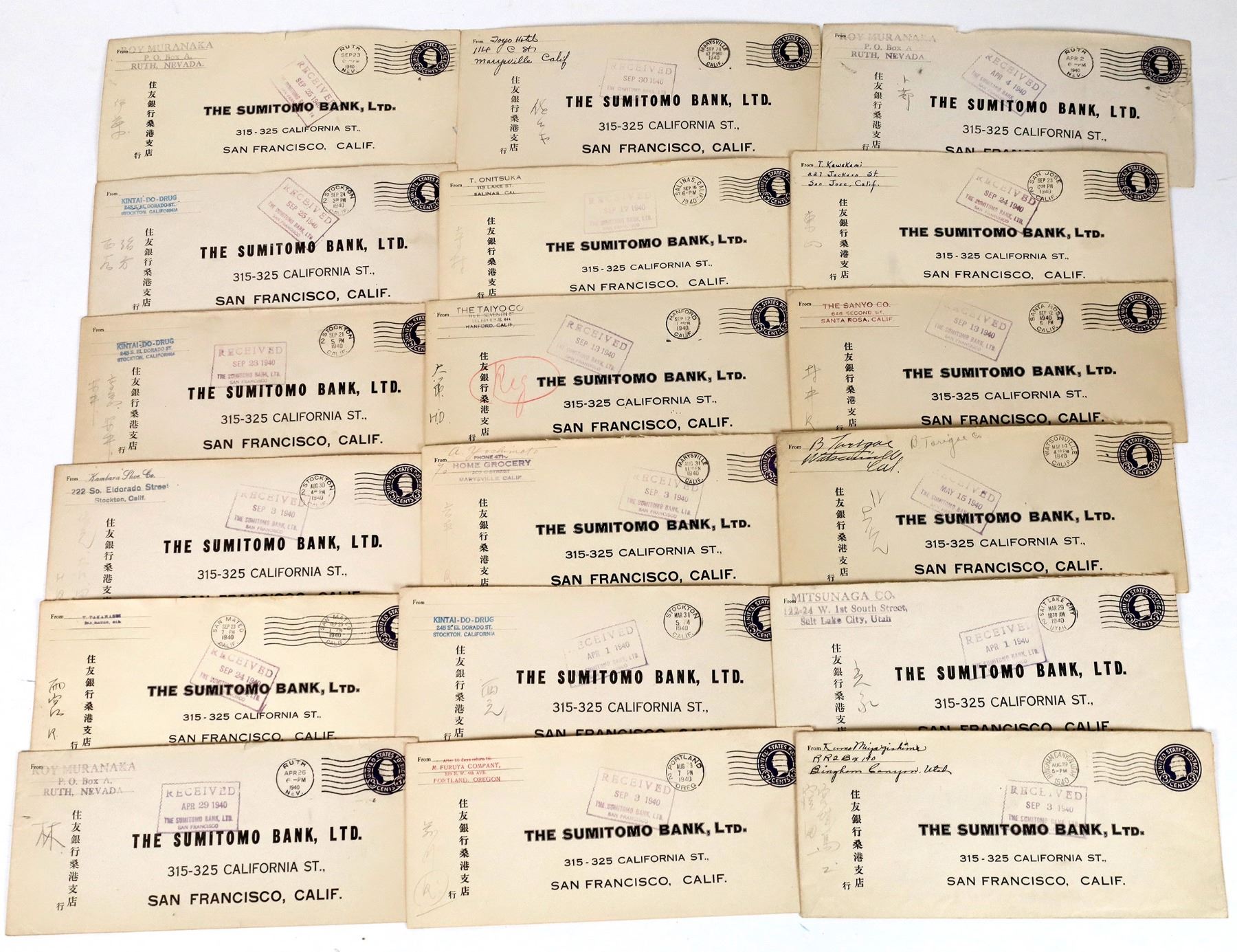 Nineteen legal covers addressed to the Sumitomo Bank in San Francisco. Each of these covers is from a Japanese merchant on California or Nevada, all dated prior to WW2, thus many of these unfortunate American merchants may have been incarcerated after Pearl Harbor. Cities include Stockton, Salinas, San Jose, Hanford, Santa Rosa, Marysville, Watsonville, San Mateo, Ruth Nevada, Bingham Canyon Utah, Salt Lake City and Portland Oregon. All with Japanese writing at left.