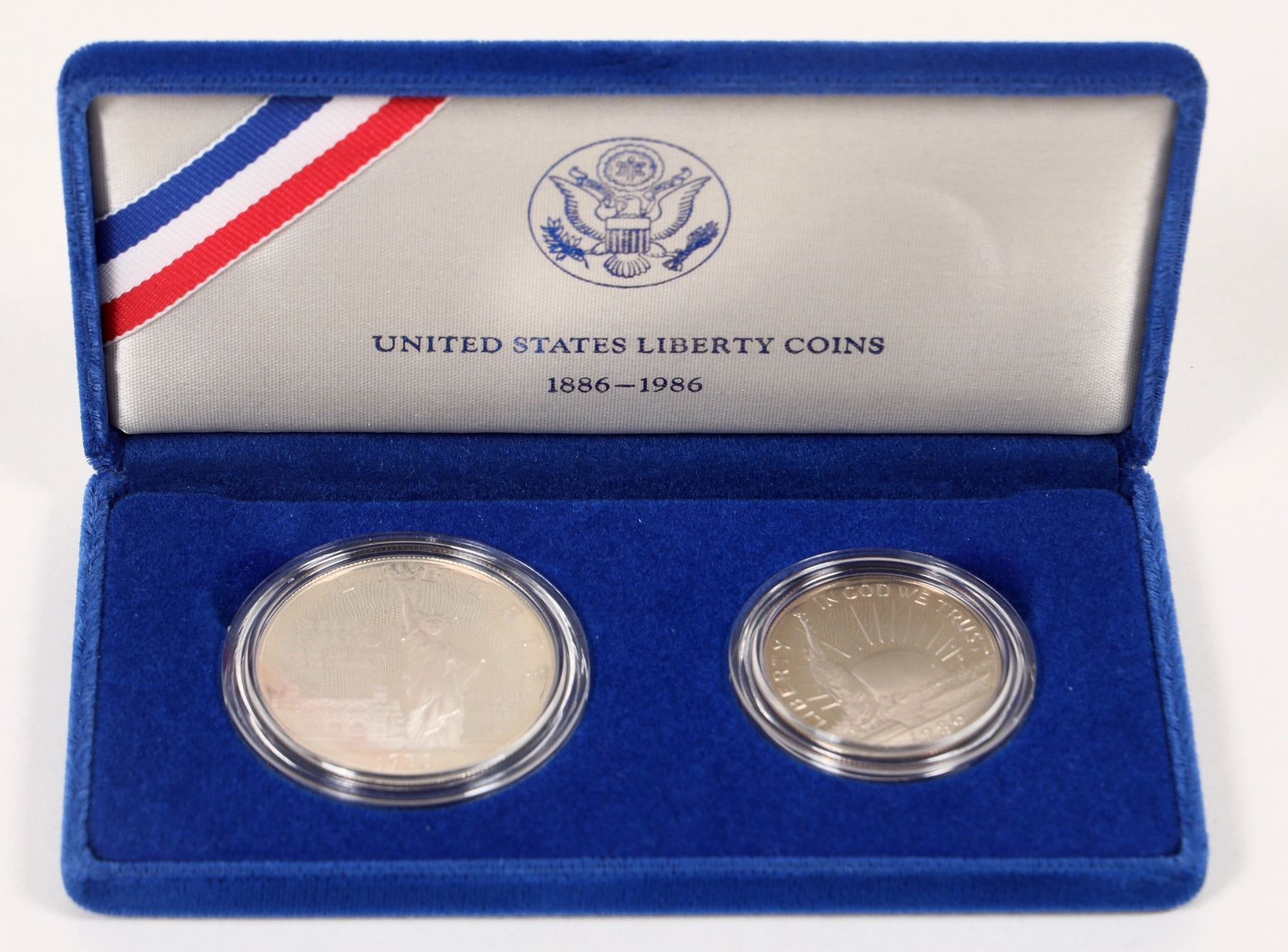1986 issue in original U. S. Mint packaging, with original paperwork: Ellis Island Gateway To America centennial commemorative silver dollar and half dollar. Dollar is .77 troy oz. silver, .900 fine; half dollar is copper/nickel.