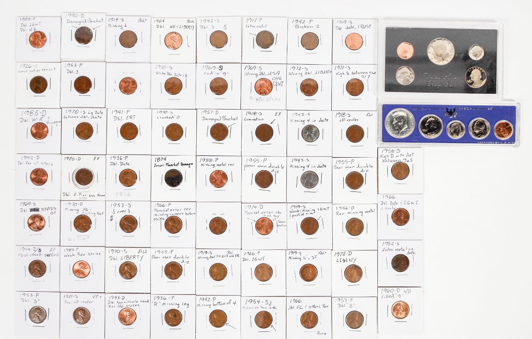 Sixty two Lincoln cent errors: clipped planchet, worn dies, poor strikes, die breaks, laminations, two error sets: 1967 Special Mint Set with the cent upside down; 1983 Proof Set doubling on date and "S".