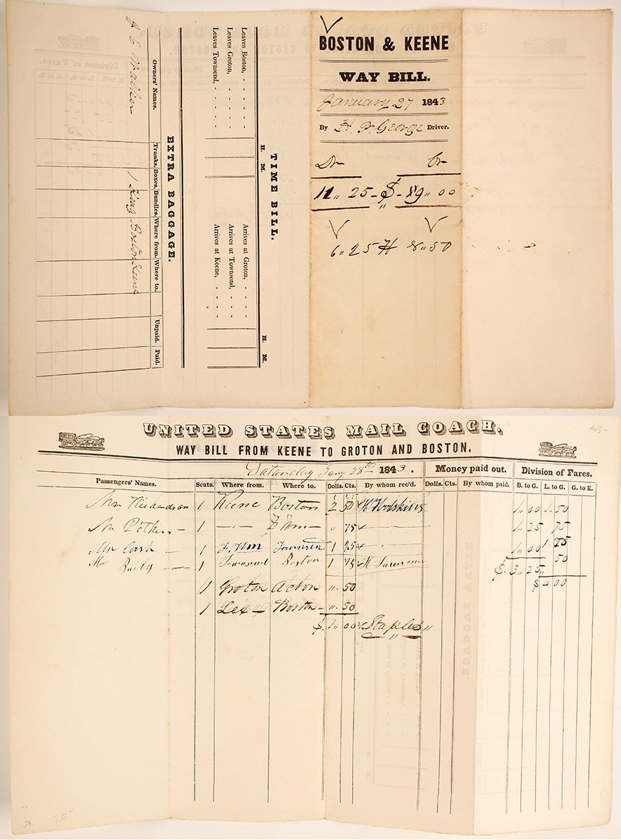 Way Bill from Keene to Groton and Boston. This has passengers' names, where from, where to Dollars/Cents. 14" x 9". Date: 1843 Location: New Hampshire HWAC# 64377
