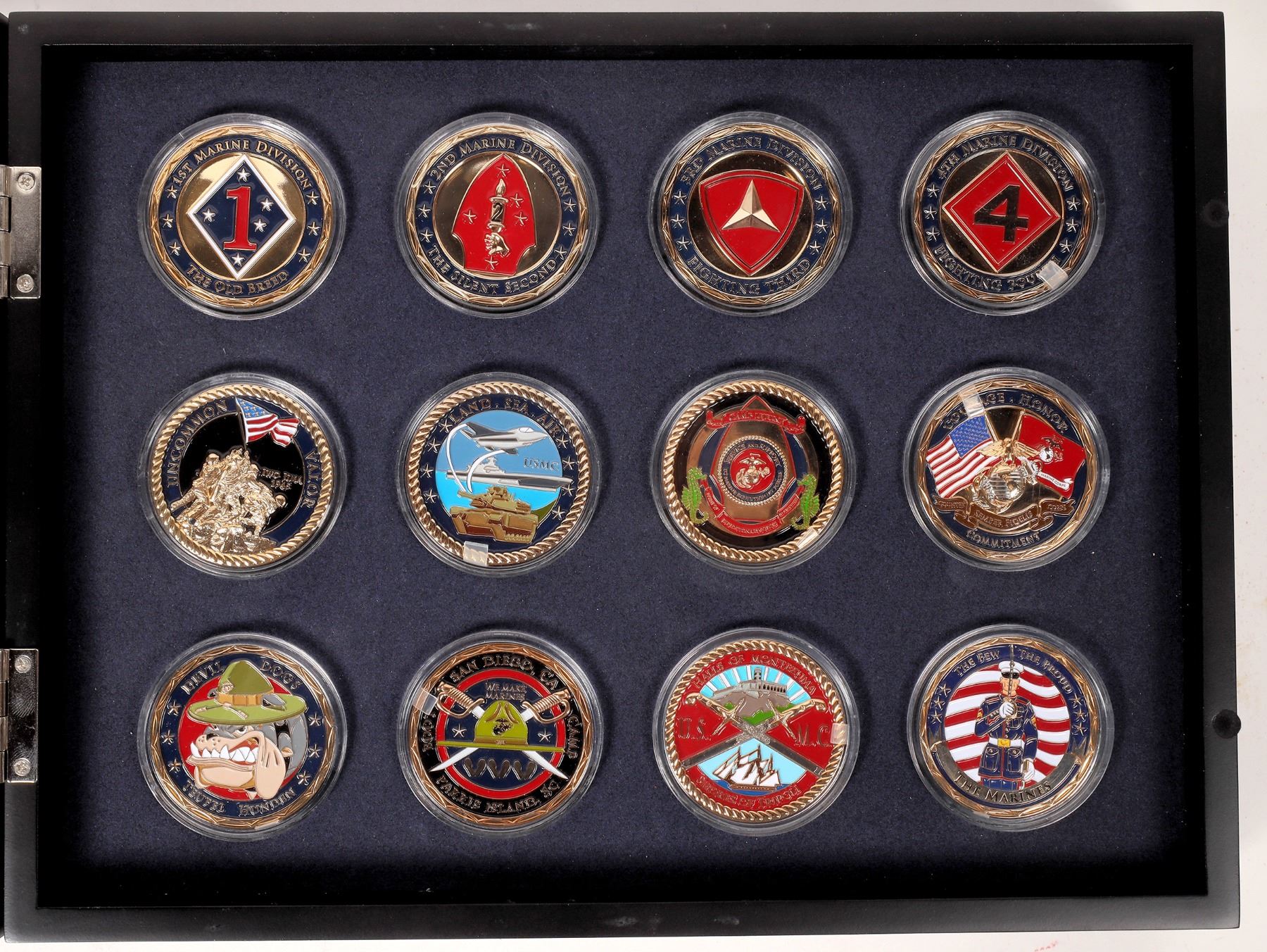 Issued by the Bradford Exchange: Glass topped case ( 13 x 10 x 3 inches), with 12 colorfully enameled challenge coins of the United States Marine Corps. With Certificates of Authenticity and a brochure describing each coin.