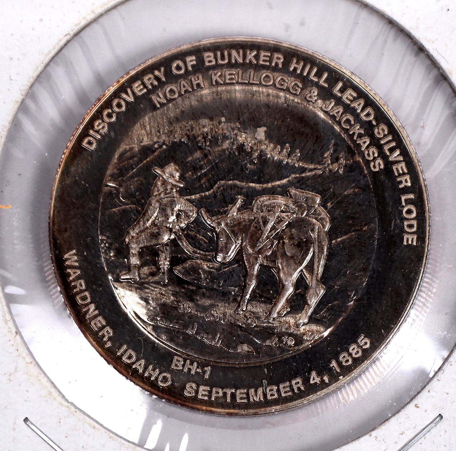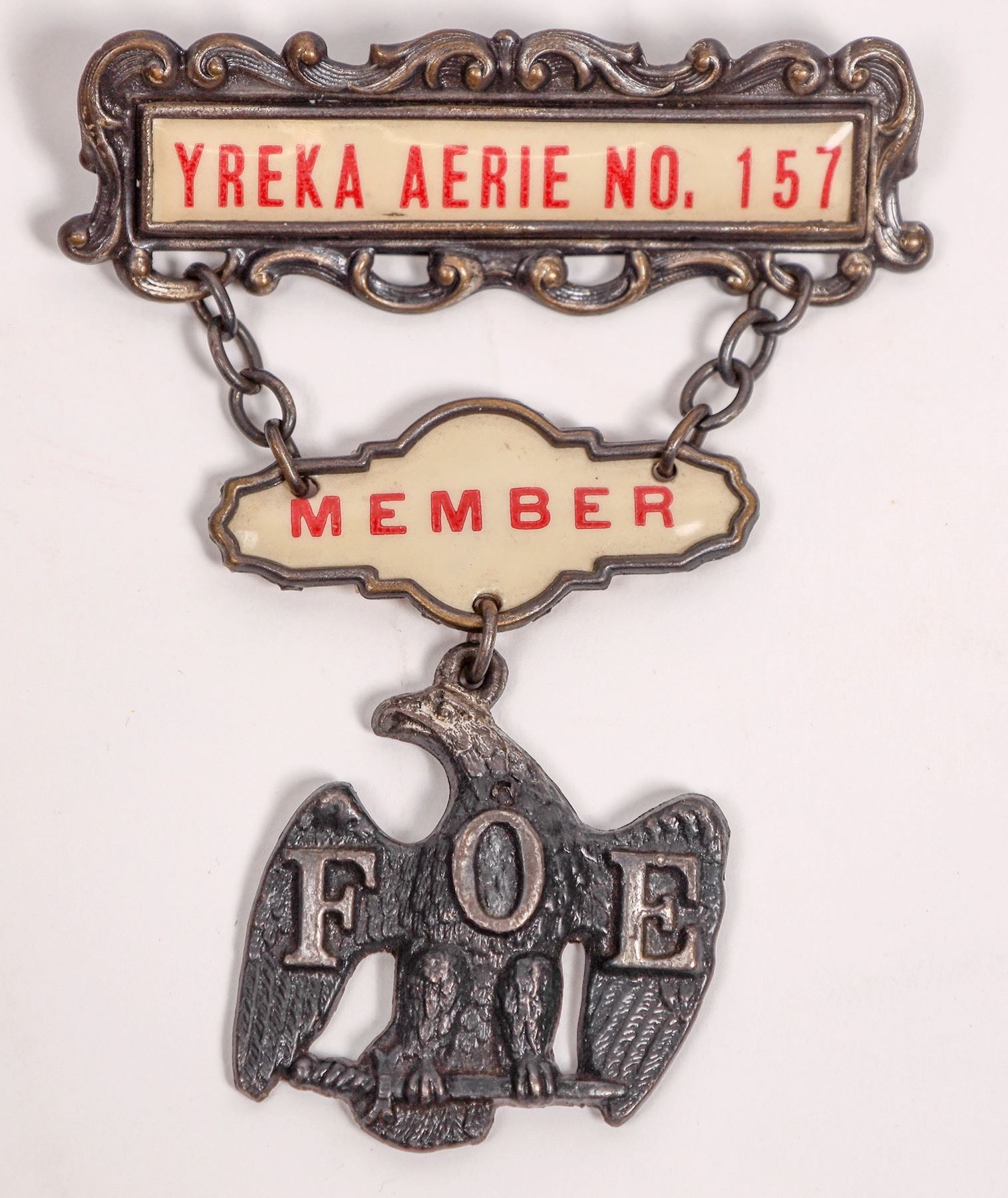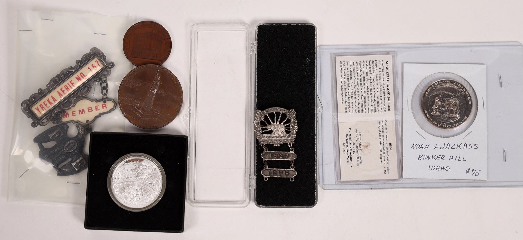 Lot of six items: 1) limited edition one ounce silver round from Bunker Hill Mine in Idaho;2) Yreka Aerie No. 157 / F. O. E. member badge; 3) 1937/1938 California National Guard award; 4) Odd Fellows Temple Philadelphia 1895; 5) Statue of Liberty French Medal 1884; 6) silver medallion commemorating the Big Bonanza issued by Marshall Mint, in original box with paperwork. No. 512 of 5,000. City: State: Date: Salvatore Falcone Collection