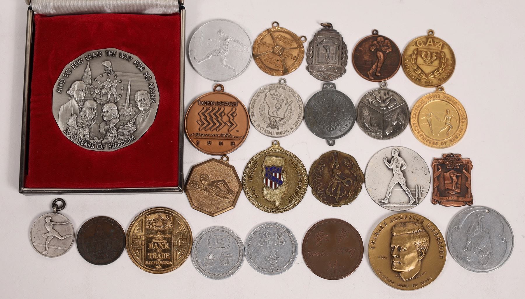 Lot of over 25 medals from the United States. Twenty sports medals; 200 years of freedom, Bicentennial from the Hamilton Mint in original case; Charles Lindbergh; Colonial Jack; Wall Street hard times token; four Chinese American tokens. City: State: Date: Salvatore Falcone Collection