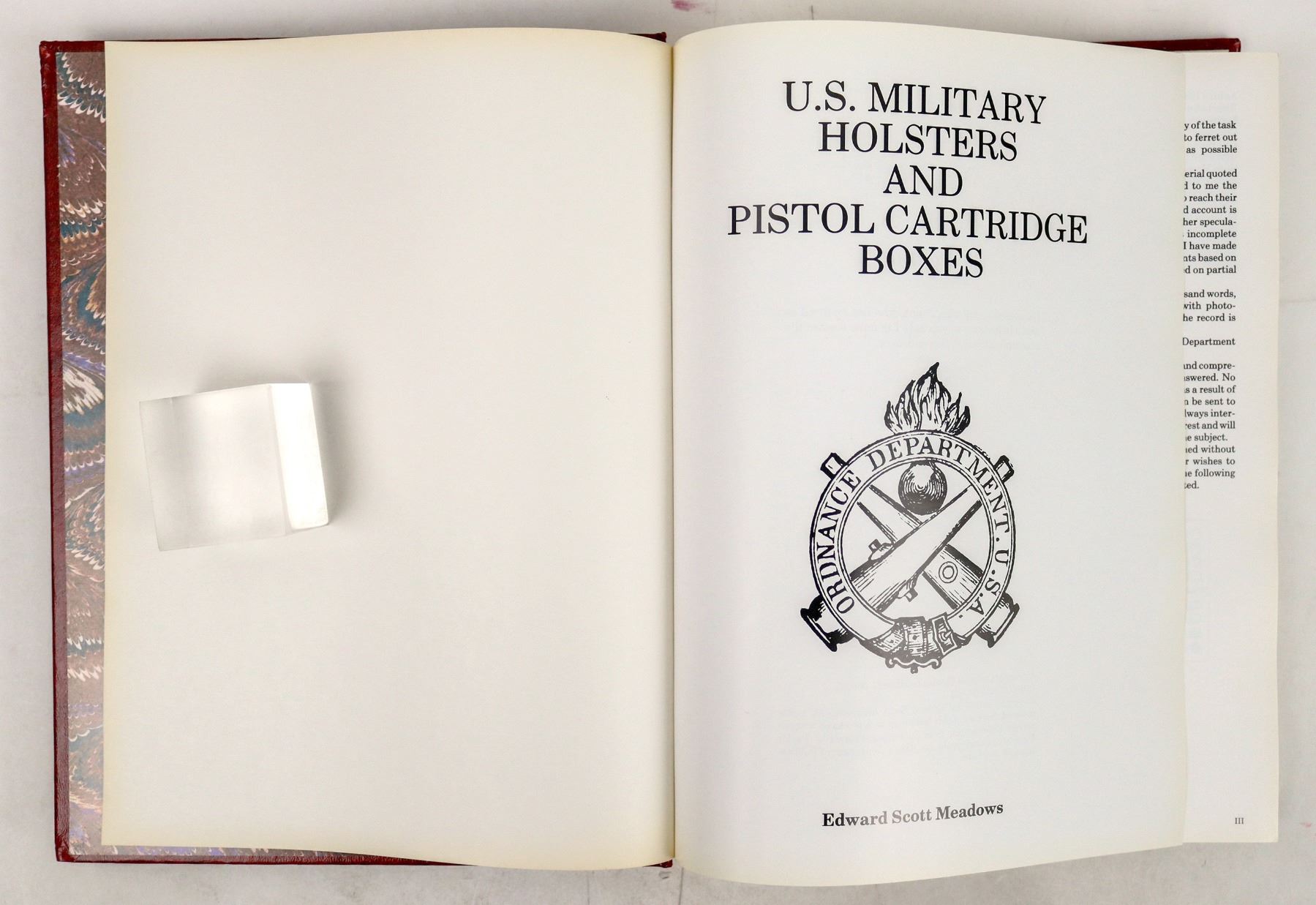 This book "U.S. Military Holsters and Cartridge Boxes" by Edward Meadows may arguably be the most comprehensive study on holsters in American history. Hardcover at pp. 430, red leather cover and gold embossed lettering, no DJ, slightly rounded corners in very good condition. The author begins his study at the onset of the military from the flintlock period, including the percussion era horse pistol holsters changing to belt holsters in 1861 Ordnance due to the acceptance of the model 1851 Colt Navy belt pistol. That changed everything. Well illustrated with B&W photos. The appendix lists all Rock Island employees and inspectors making leather goods. A list of manufacturers is also listed. Many ordnance blueprints for holster construction is included and dated. If you collect military pistols you will eventually need this book. Please see photos for details.