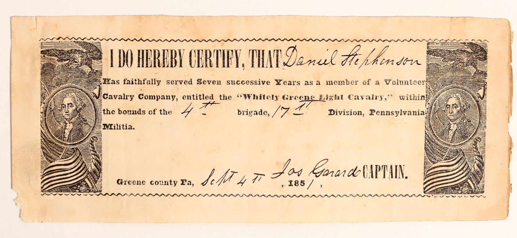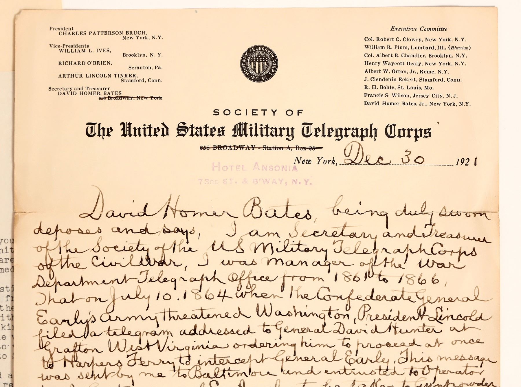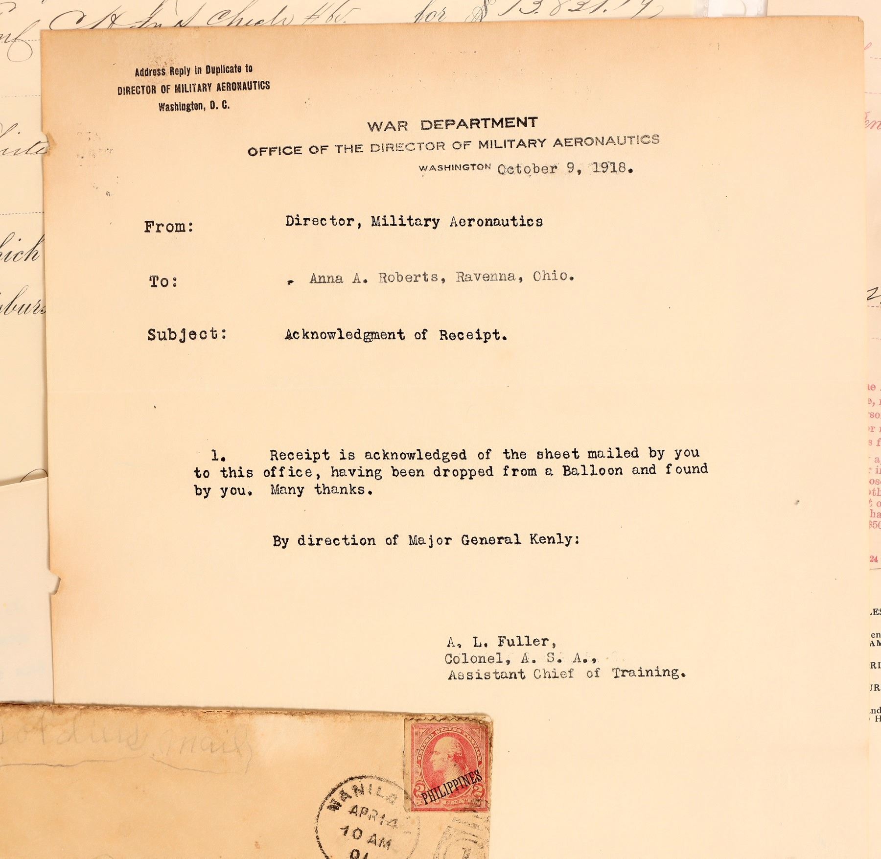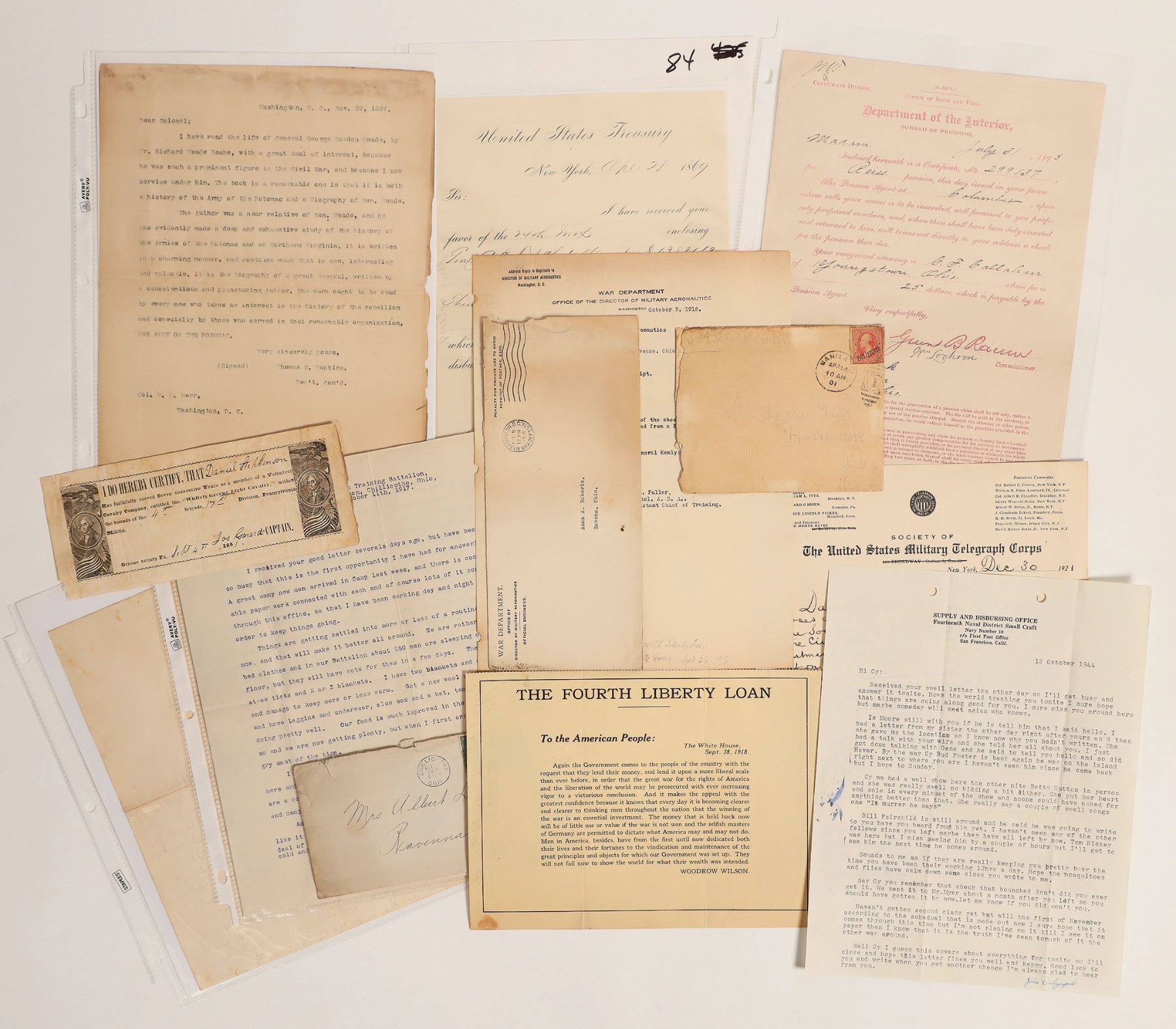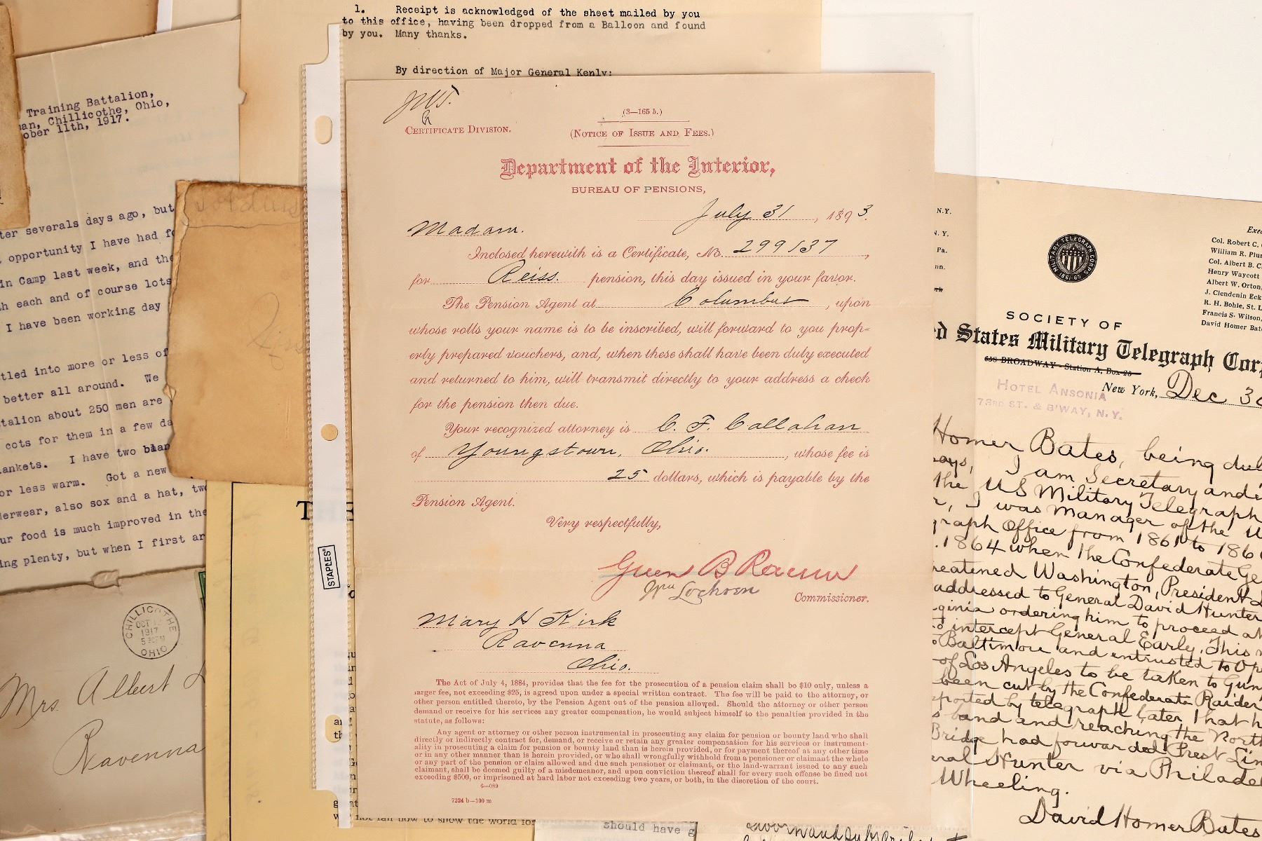 A group of eleven interesting military-related letters and pieces of ephemera, dating 1869-1944. The letters include personal accounts of military life, an official letter from the U.S. Military Telegraph Corps, and a note of thanks from the War Department to an Ohio citizen for mailing in a paper dropped from a military balloon. The ephemera includes a certification of military service, a public announcement from the administration of Woodrow Wilson, a certificate of military pension, and a receipt from the U.S. Treasury. Items originate from several U.S. cities.[