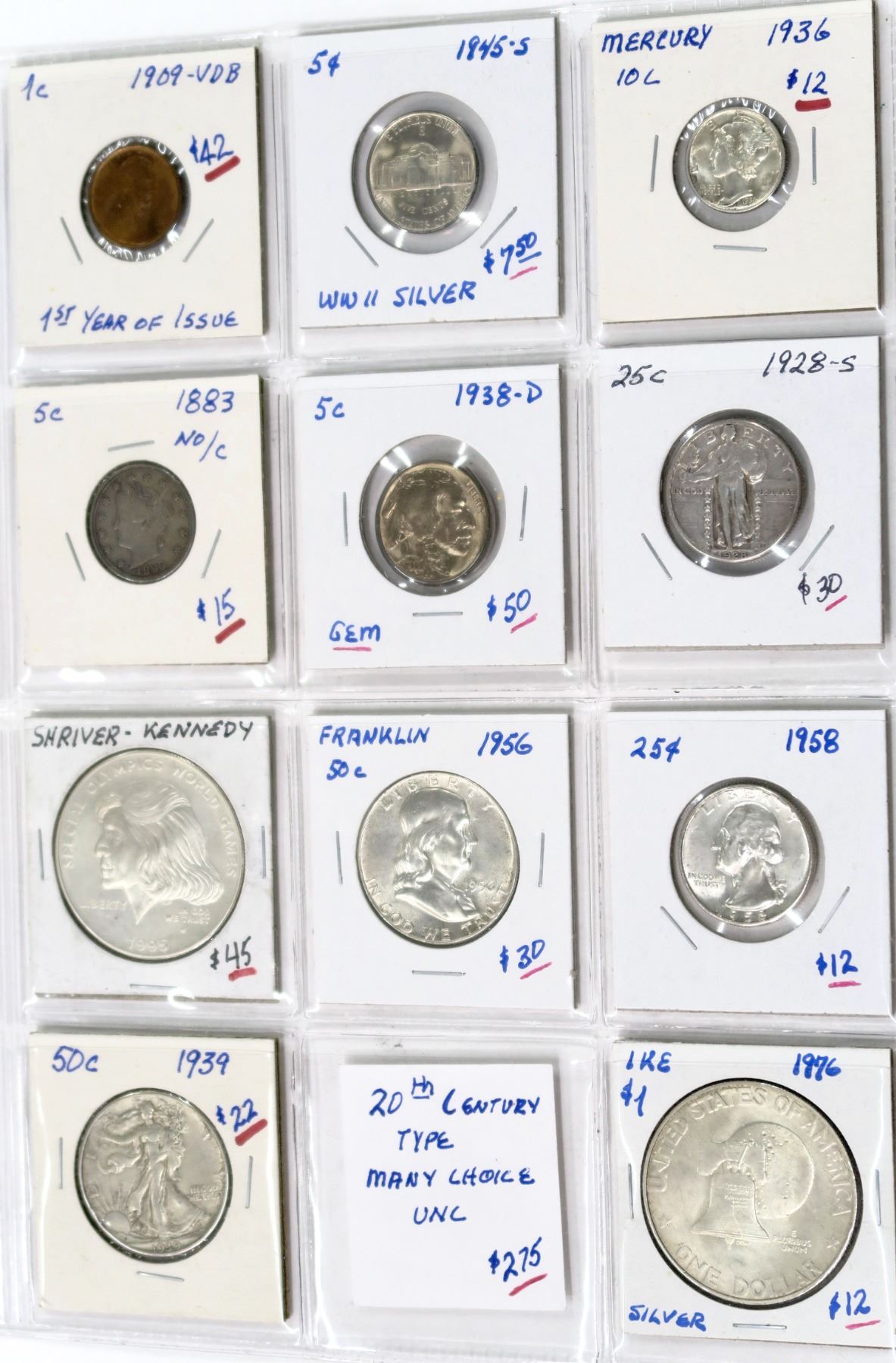 Eleven U.S. Mint coins with something individually special: 1909-VDB penny, first year of issue; 1845-S WWII silver nickel; 1936 Mercury dime; 1883 nickel (okay, but that's the only 19th century one); 1938-D gem unc nickel; 1928-S quarter; 1995 Special Olympics World Games dollar with Eunice Kennedy Shriver's image; 1956 Franklin half dollar; 1958 quarter; 1939 Liberty half dollar, and a 1996 Eisenhower dollar. See photo for details.