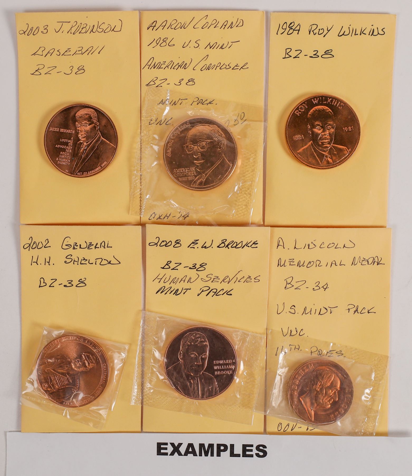 Lot of eleven bronze medals made by the U. S. Mint to honor famous men: Abraham Lincoln, 34 mm; 2002 General H. H. Shelton, 38 mm; 1983 Fred Waring Musician, 38 mm; 2008 E. W. Brooke, 38 mm; 2006 N. Borlaug, 38 mm; 2003 Jackie Robinson, 38 mm; 1986 Aaron Copland, 38 mm; 1981 D. Regan, 34 mm; 1984 Roy Wolkins, 38 mm, (3).