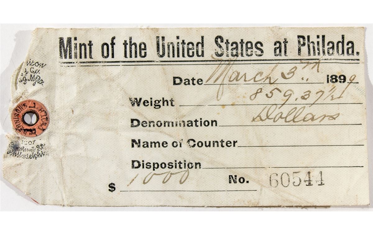 A used coin bag tag for Morgan dollars! Date: March 3rd, 1899. Weight: 859.37 1/2 oz. Denomination: Dollars. $1,000. No. 60544. Measures 2.5" x 5" Reverse has leftover wax from seal.