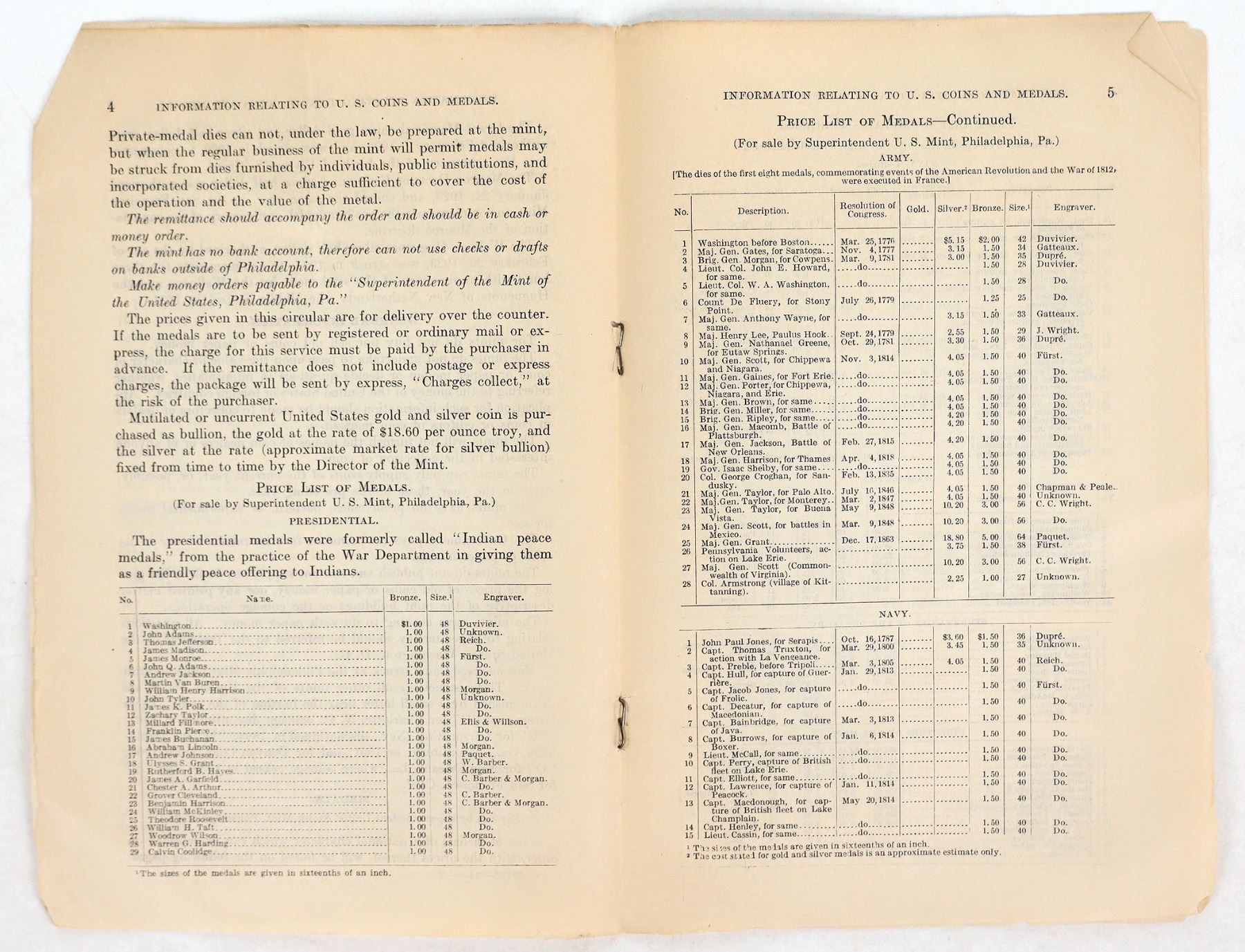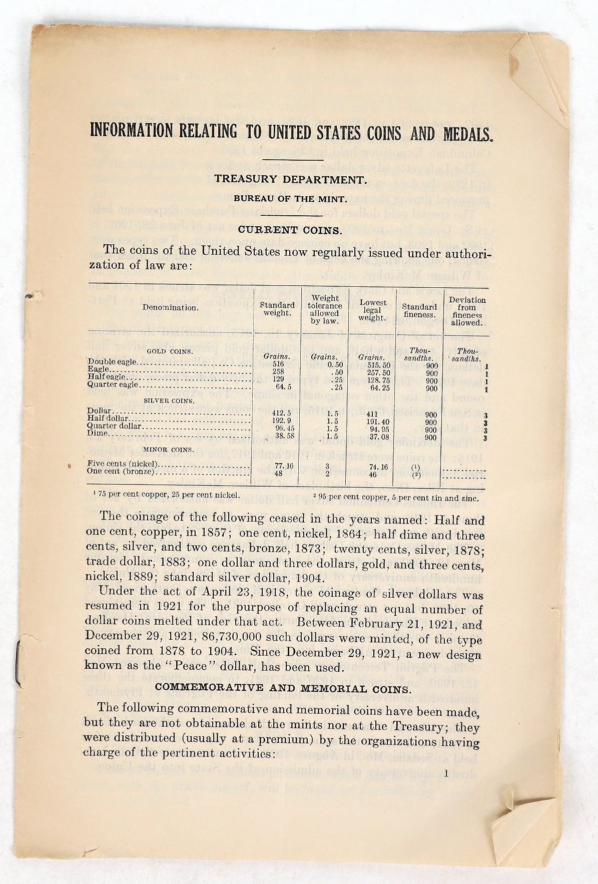Seven page brochure 6 x 9 inches: "Information Relating to United States Coins and Medals," published by the Treasury Department Bureau of the Mint. Includes commemorative and memorial coins and price lists of the medals. Published February 23, 1924 by R. J. Grant, Director of the Mint.