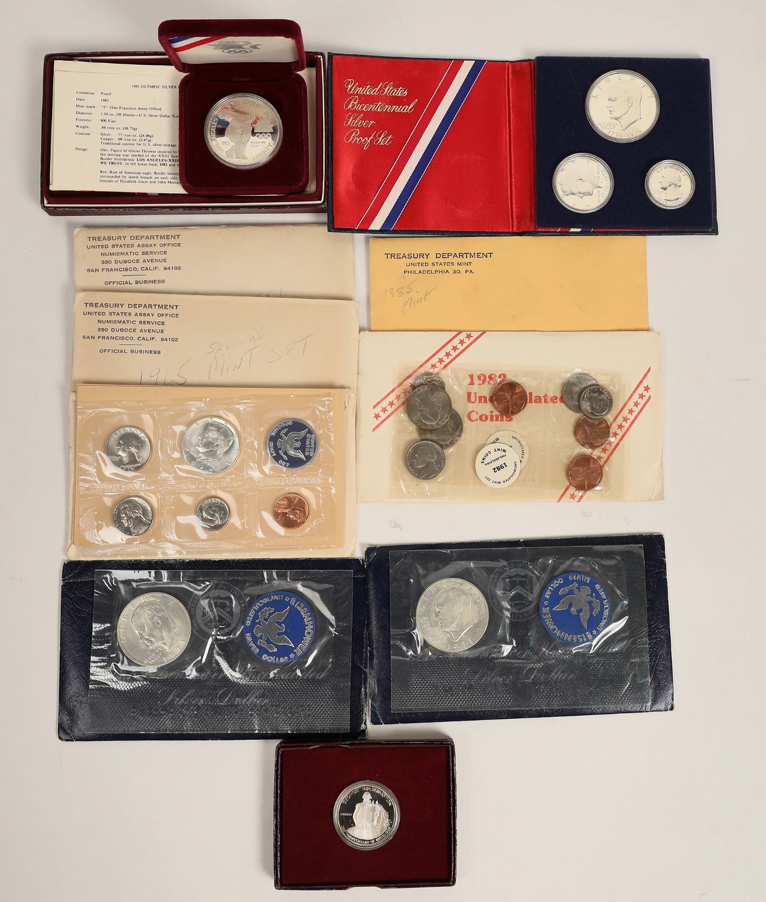 Miscellaneous products from the U. S. Mint: three 1965 Special Mint Sets; two 1971 Eisenhower Uncirculated Silver Dollars; 1976 Bicentennial Silver Proof Set; 1982 proof Washington Quarter; 1982 Uncirculated Coins Set; 1984 Los Angeles Olympic Silver Dollar; 1985 Mint Set.