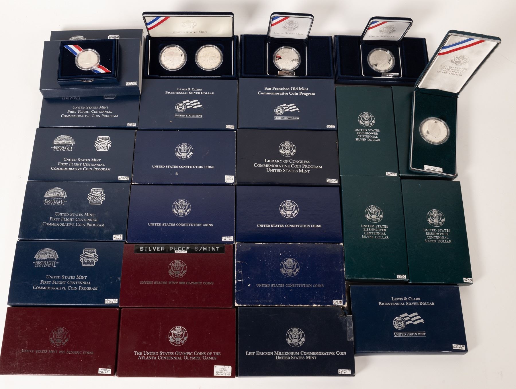 Lot of 26 products of the U. S. Mint. Four 1987 U.S. Constitution proof silver dollars; 1988 proof Olympic silver dollar; Five 1990 Eisenhower Centennial proof silver dollar; 1992 Olympic coins: proof silver dollar, clad half dollar; 1995 Olympic coins: proof silver dollar, clad half dollar; 2000 Leif Ericson Millennium proof silver dollar; 2001 American Buffalo Commemorative coins: proof and Unc. silver dollars; 2003 First Flight Centennial: one proof silver dollar; three proof clad half dollars, two Unc. clad half dollars; Three 2004 Lewis & Clark Bicentennial silver dollars (two proof, one Unc.); 2006 San Francisco Old Mint Unc. silver dollar.