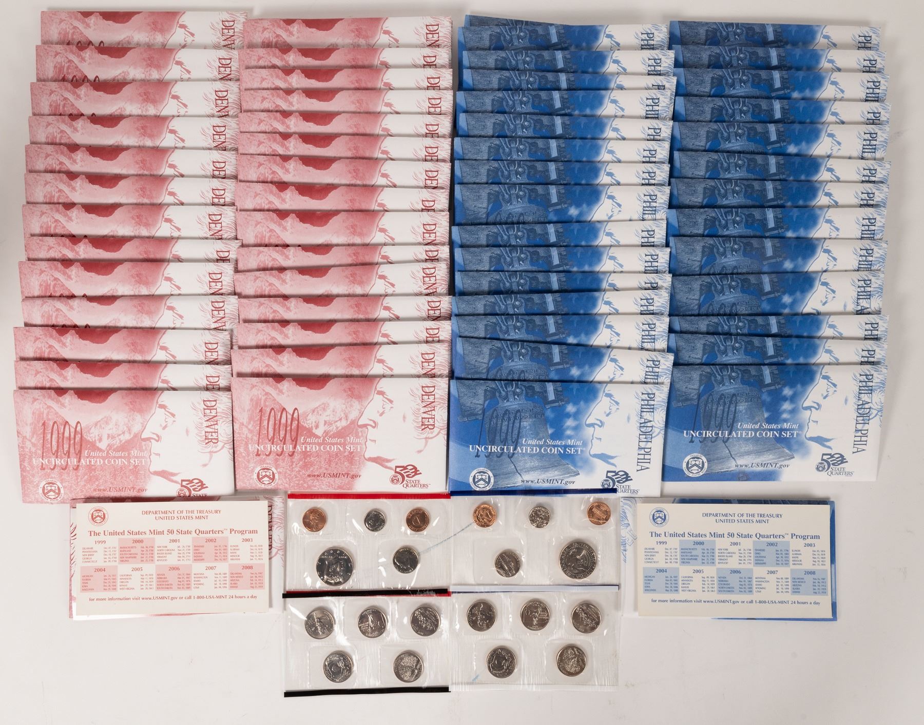 Dealer lot of thirty sets of 1999 uncirculated U. S. Mint sets. The first year of the statehood quarters! Two envelopes, each with nine coins: one minted at Denver, and one at Philadelphia.