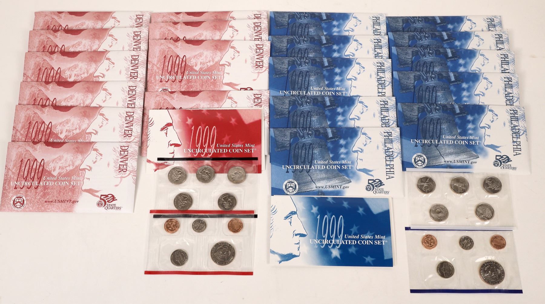 Lot of ten 18 coin U. S. Mint sets from 1999, containing the first U. S. statehood quarters. Two envelopes, each with nine coins: one minted at Denver, and one at Philadelphia.