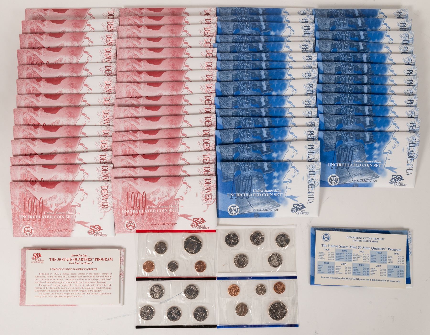 Dealer lot of thirty sets of 1999 uncirculated U. S. Mint sets. The first year of the statehood quarters! Two envelopes, each with nine coins: one minted at Denver, and one at Philadelphia.