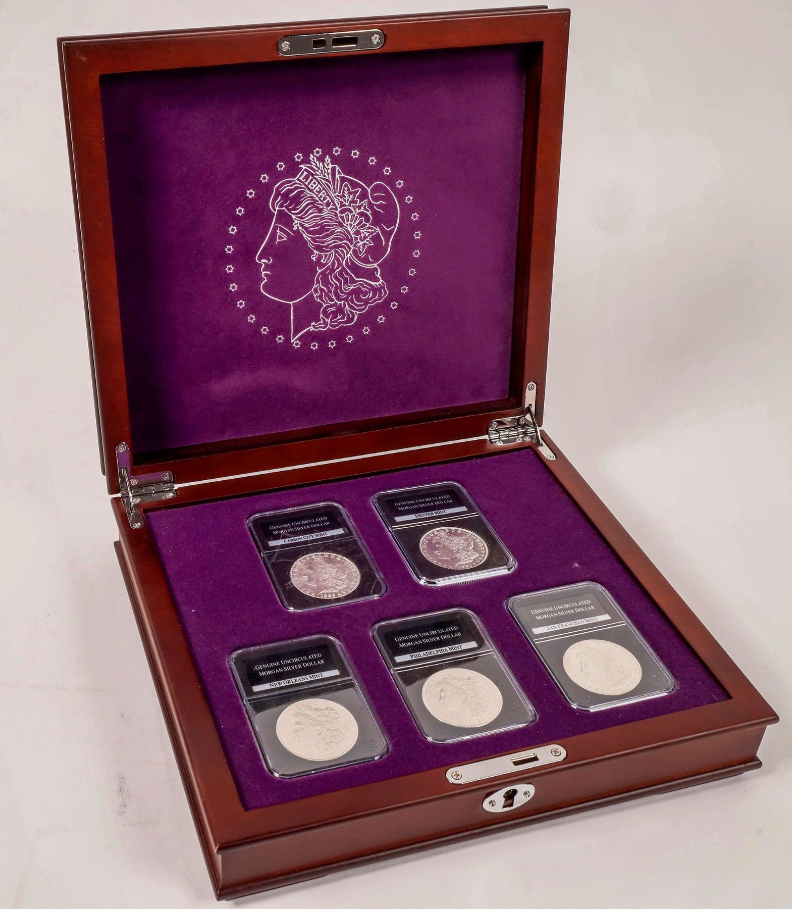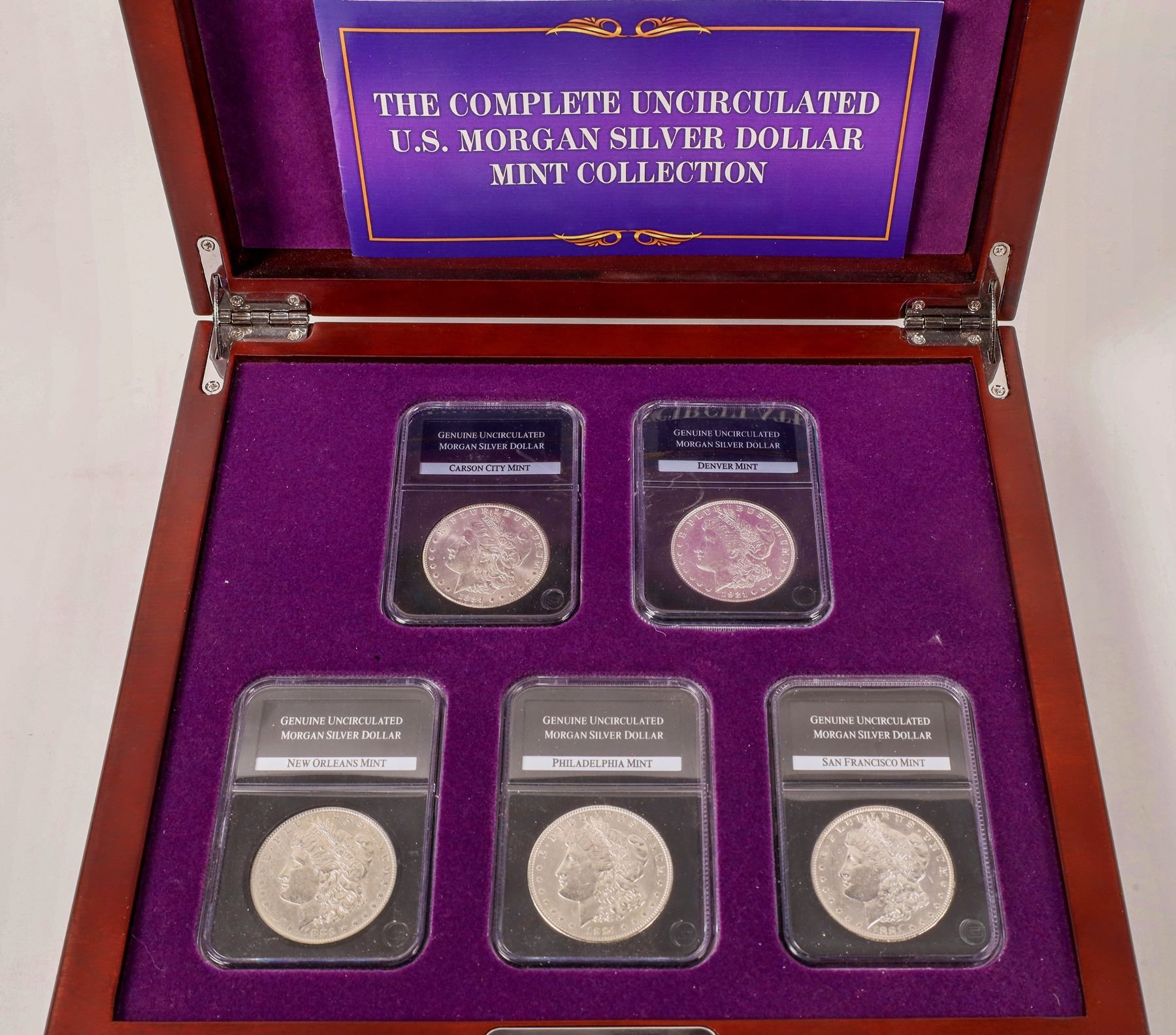 Issued by PCS Stamps and Coins: The Complete Uncirculated U. S. Morgan Silver Dollar Mint Collection. Five slabbed Morgan Dollars: one from each mint. PCS labelled them Genuine Uncirculated Morgan Silver Dollar but included this disclaimer in their marketing: "These uncirculated-condition coins are inspected (but not professionally graded) to ensure they have no trace of wear. We strive to offer coins with good eye appeal based on feedback from our customers. Please note that the coins may show contact marks, they may have been cleaned, and their surface may lack some luster." The elegant wooden chest (measures approximately 10Ω" x 9Ω" x 3") and booklet, detailing the coin's history and design are included. The 1884-CC has full breast feathers and minimal bag marks.