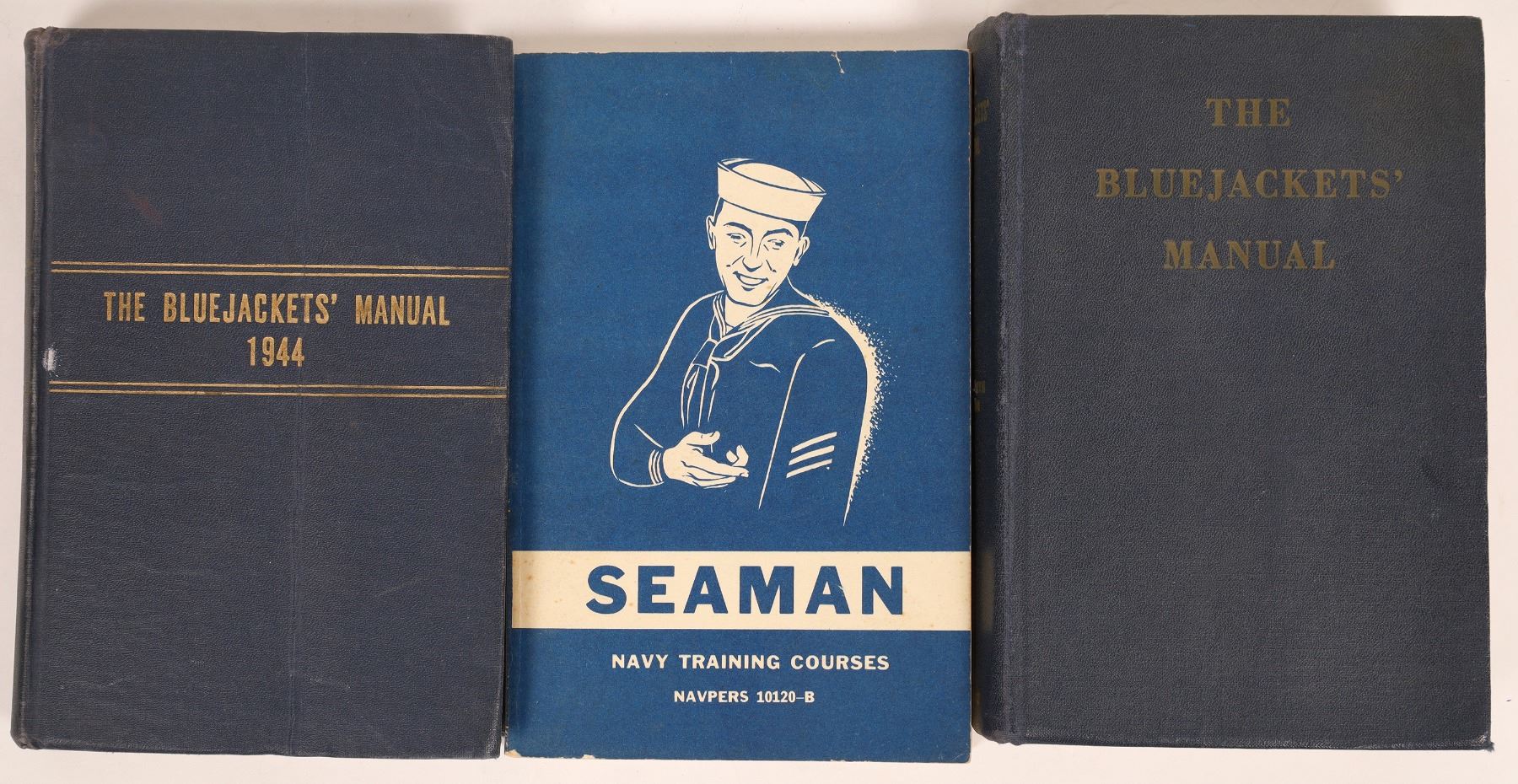 1) The Bluejacket's Manual, 1944, (12th Ed.,) by the U.S. Naval Institute, Annapolis, Md, - (5" x 8" HB, 585 pgs.); 2) The Bluejacket's Manual, 1950, (14th Ed.) by the U.S. Naval Institute, Annapolis, Md., (5" x 8", HB, 828 pgs.); 3) Seaman Naval Training Courses, 1952, by Bureau of Naval Personnel (NAVPERS 10120-B) - (5" x 8" SC, 229 pgs.)