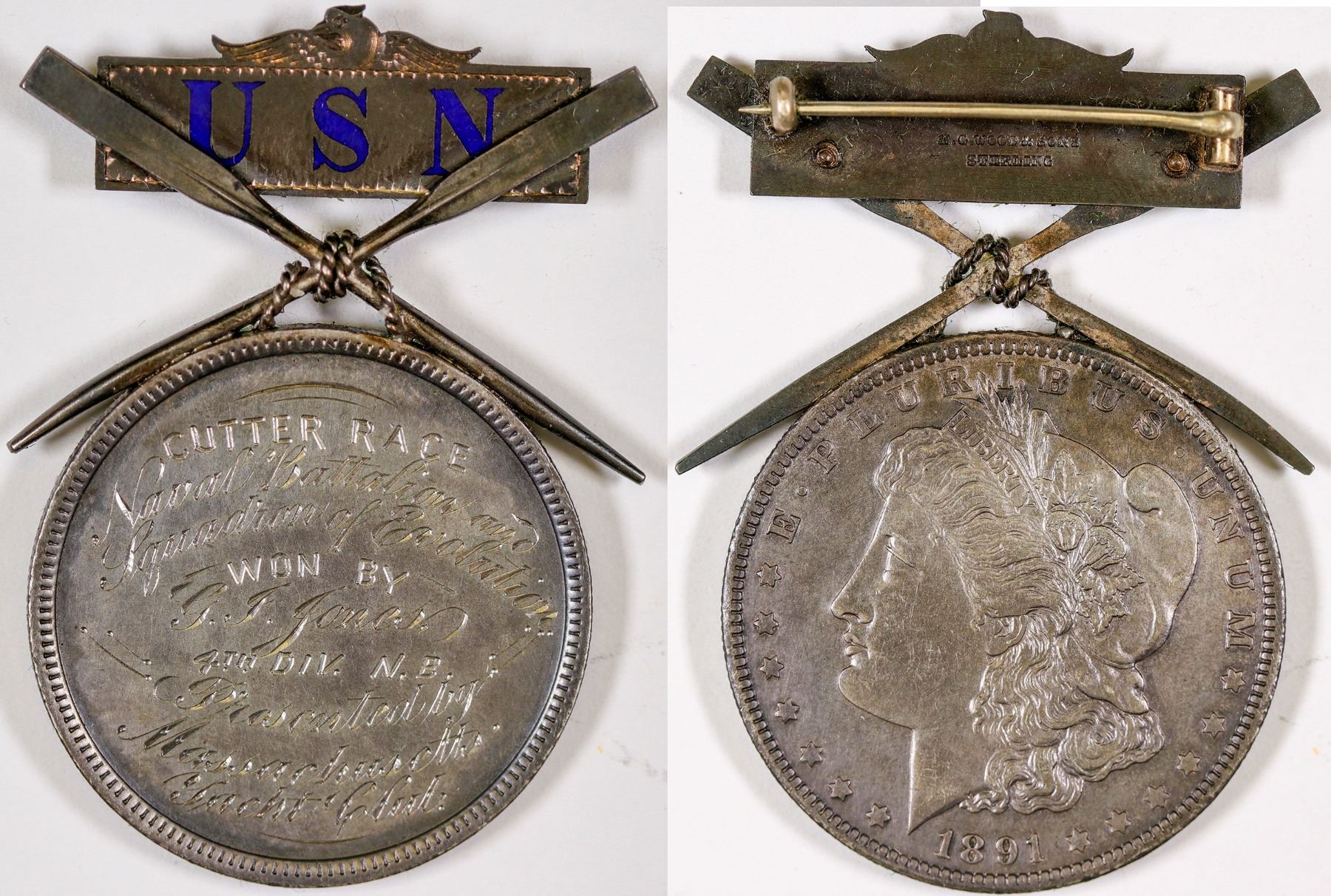 U.S. Navy mounted 1891 silver dollar, reverse engraved “CUTTER RACE / Naval Battalion and / Squadron of Evolution. / WON BY / G. F. Jones, / 4TH DIV. N. B / PRESENTED BY / Massachusetts’ / Yacht Club. After falling behind at the start of the race on July 8, 1891, the crew manning the oars of the 4th Division’s cutter pulled ahead and won. It is likely that each of the 13-man crew received a similar naval award. EF, PVC residue.