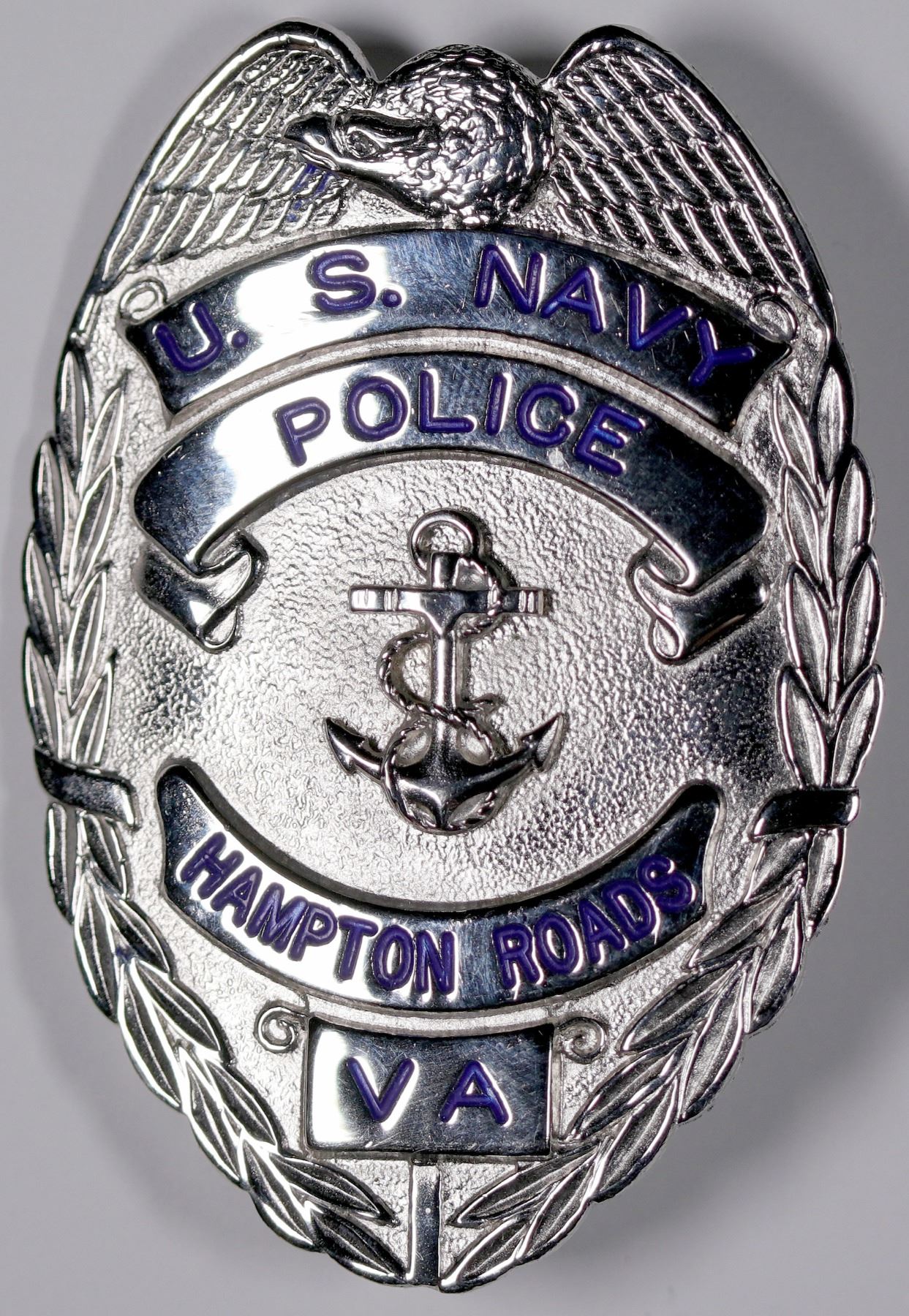 This is a U.S. Navy Police shield in silver color, issued in Hampton Roads, Va. Like new condition with fouled anchor emblem in the center. Strong pin clasp back.