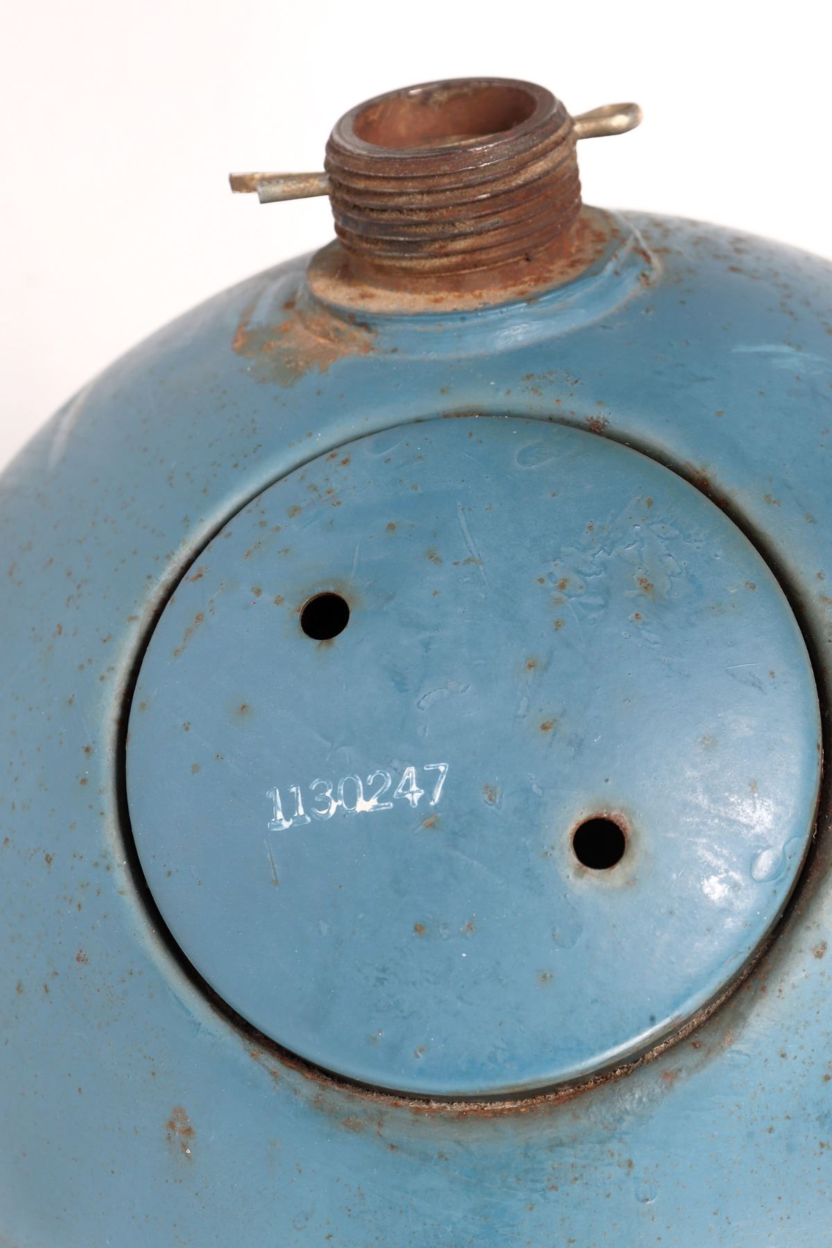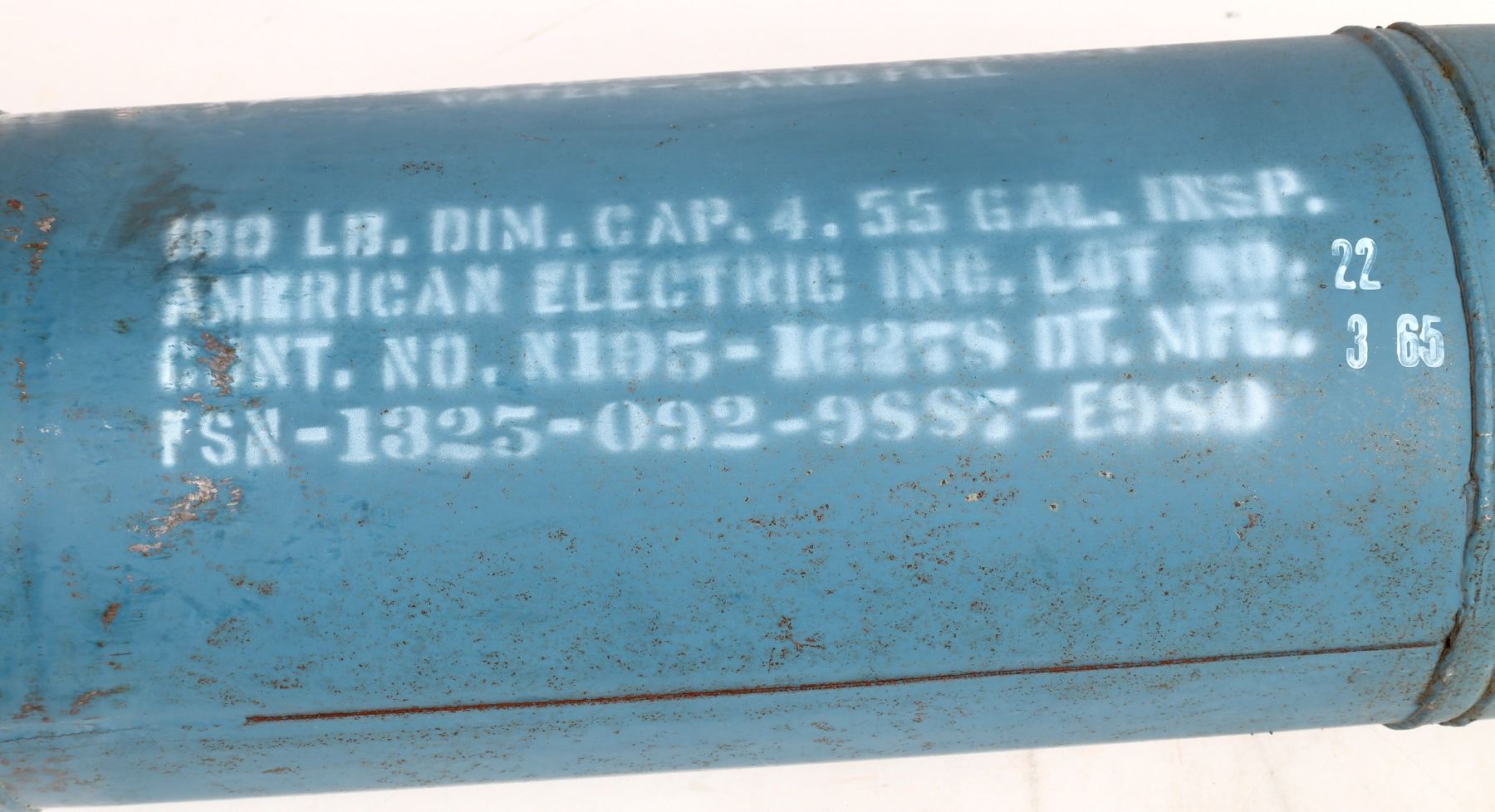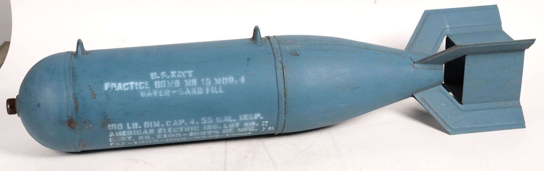 This inert training bomb was used by the U.S. Navy with a manufacture date of 3-65 (March of 1965) an MK-15 model 4 for water and sand fill. In original azure blue color stenciled with the US Navy part number and date coded. 42 in. high X 9 in in diameter, 16 lbs. tair weight. Light oxidation very good condition. Extra shipping may apply. No international sales.