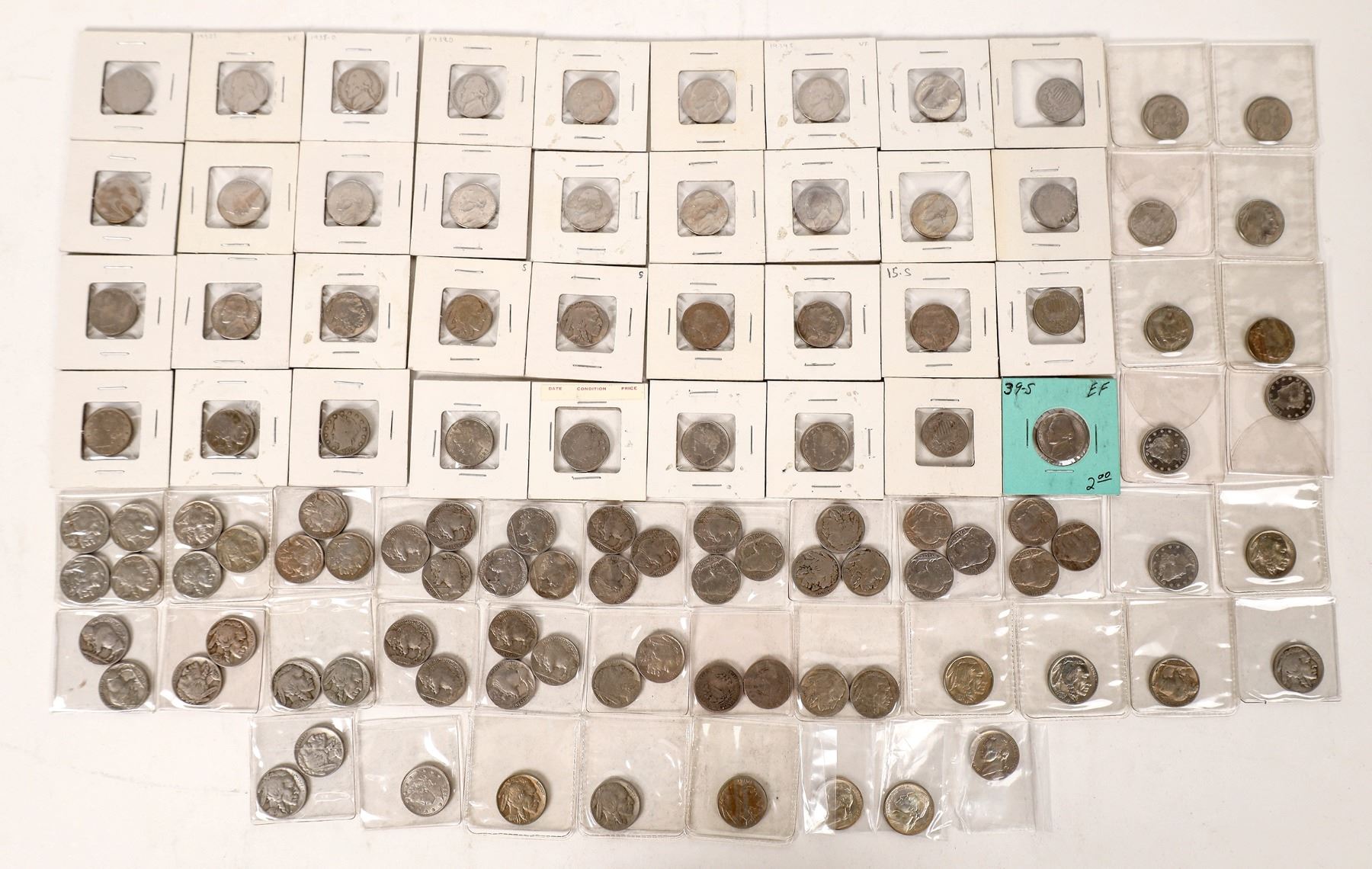 A nine inch long box of shield (4), Barber (16), Buffalo (68) & Jefferson (19). Shield nickels are 1866, 1867, 1869, 1883. Four Barber nickels of 1883 (no cents) are AU-BU condition. Buffalos include two 1913-S, and many in AU-BU condition. Jeffersons include three proofs: 1940, 1942-S and 1945-S.