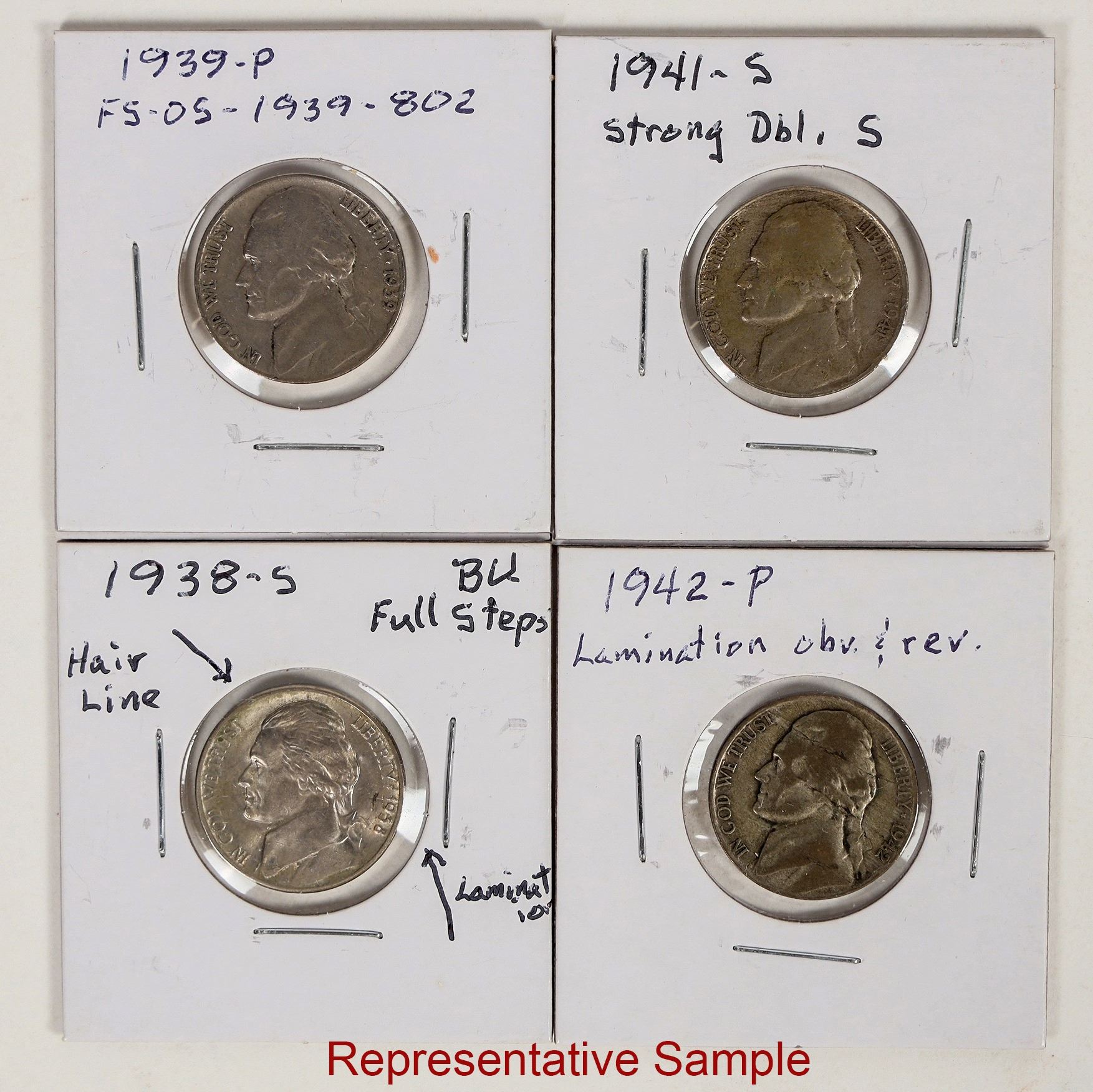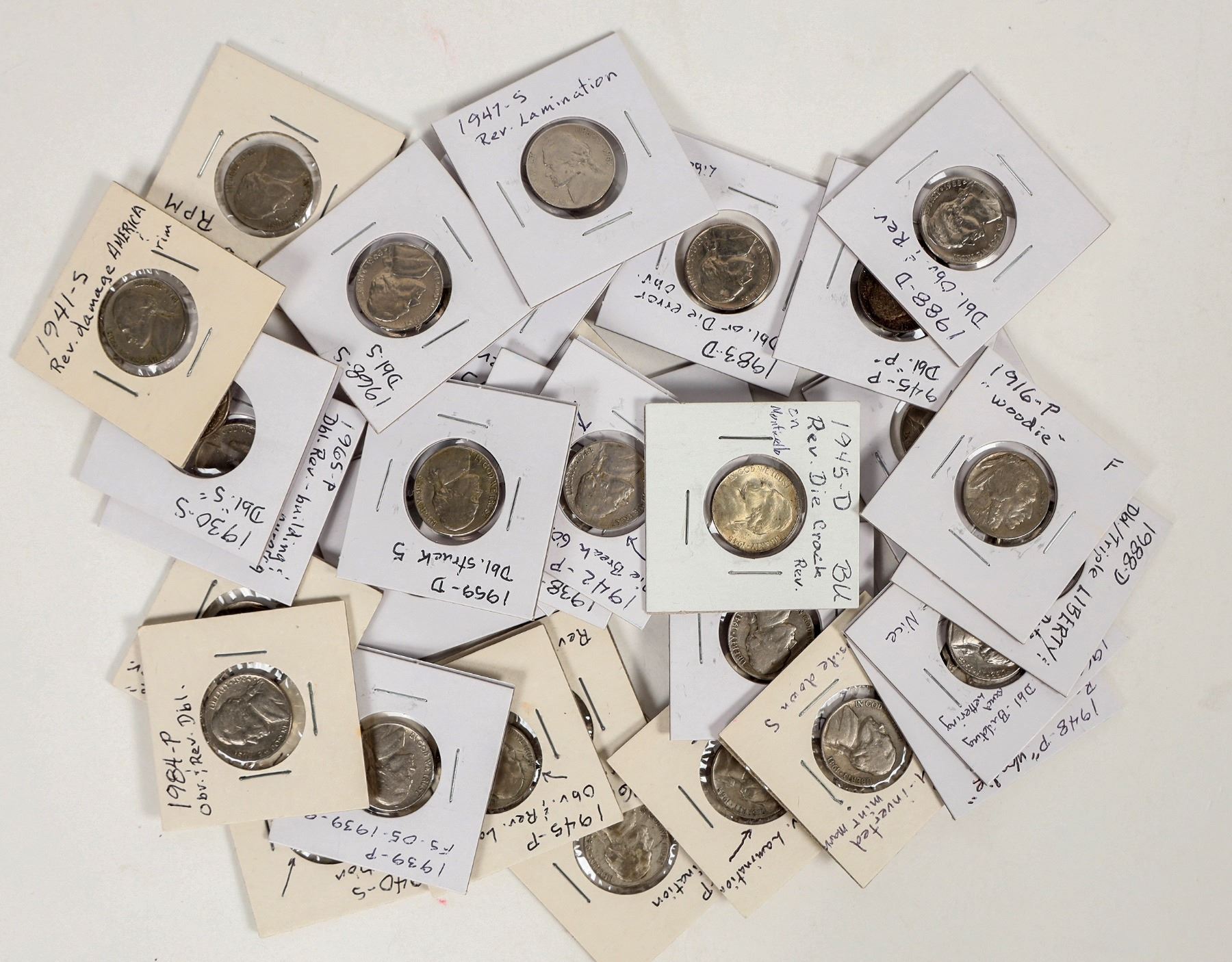 Two Buffalo and thirty three Jefferson nickels with "micro" errors. Laminations, doubled mint marks, die breaks and so on.