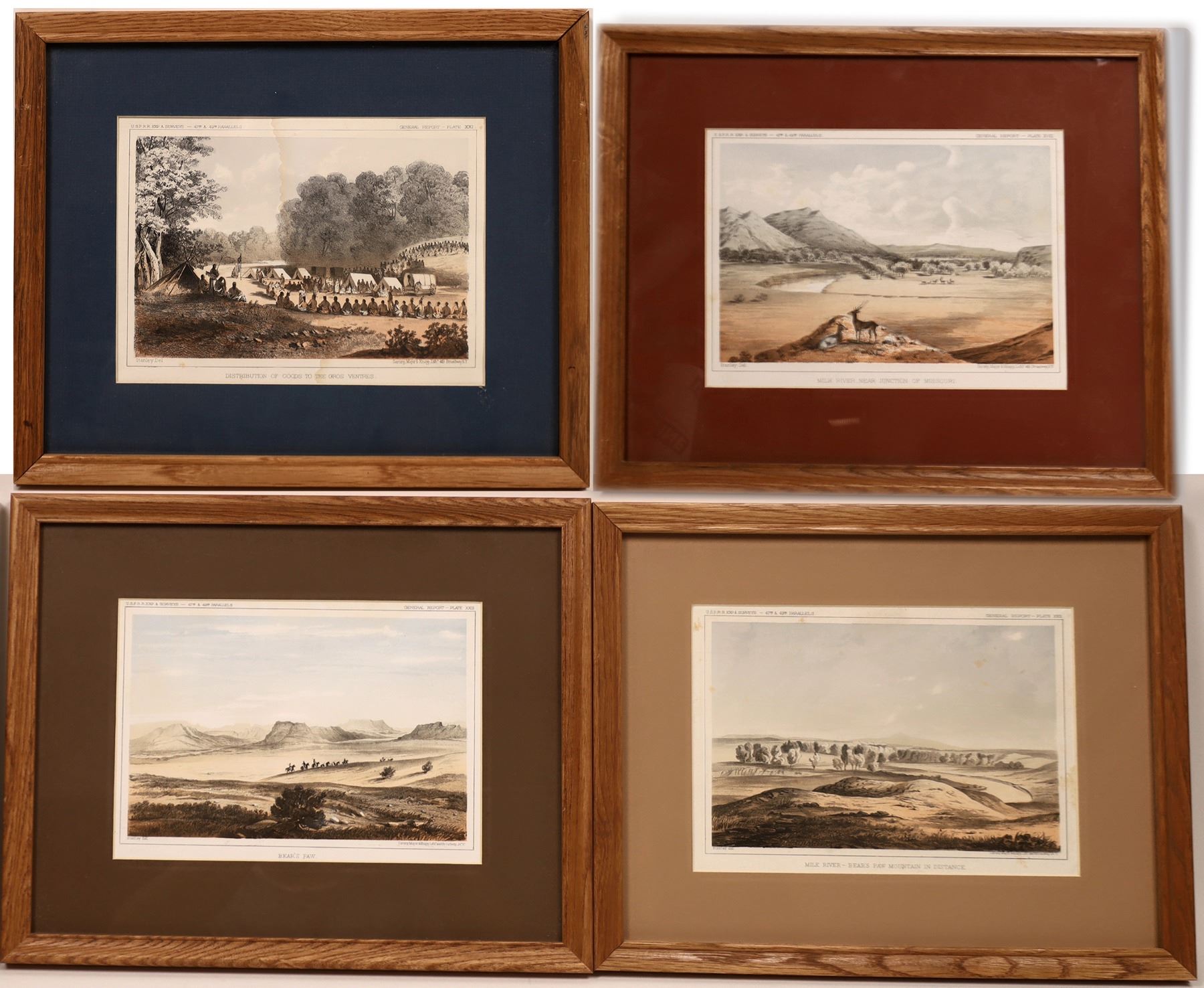 This lot of four-color lithograph prints are from the U.S. Pacific Railroad exploration and survey team of 1853-1854. The artist was John Mix Stanley published by Sarony, Major & Knapp of 449 Broadway, NY. Each lithograph sketch is approx. 7 x 9.5 inches, matted and framed at 12.5 x 15 inches. All sketches are in Montana: "Milk River, near junction of Missouri", general report plate XVIII; "Bear's Paw", plate XXIII; "Milk River-Bear's Paw Mountain in Distance" plate XXII, some foxing; "Distribution of Goods to the Gros Ventres" plate XXI, water stained. These plates have become world famous for their interest of location and how it looks today. Please see photo for details.
