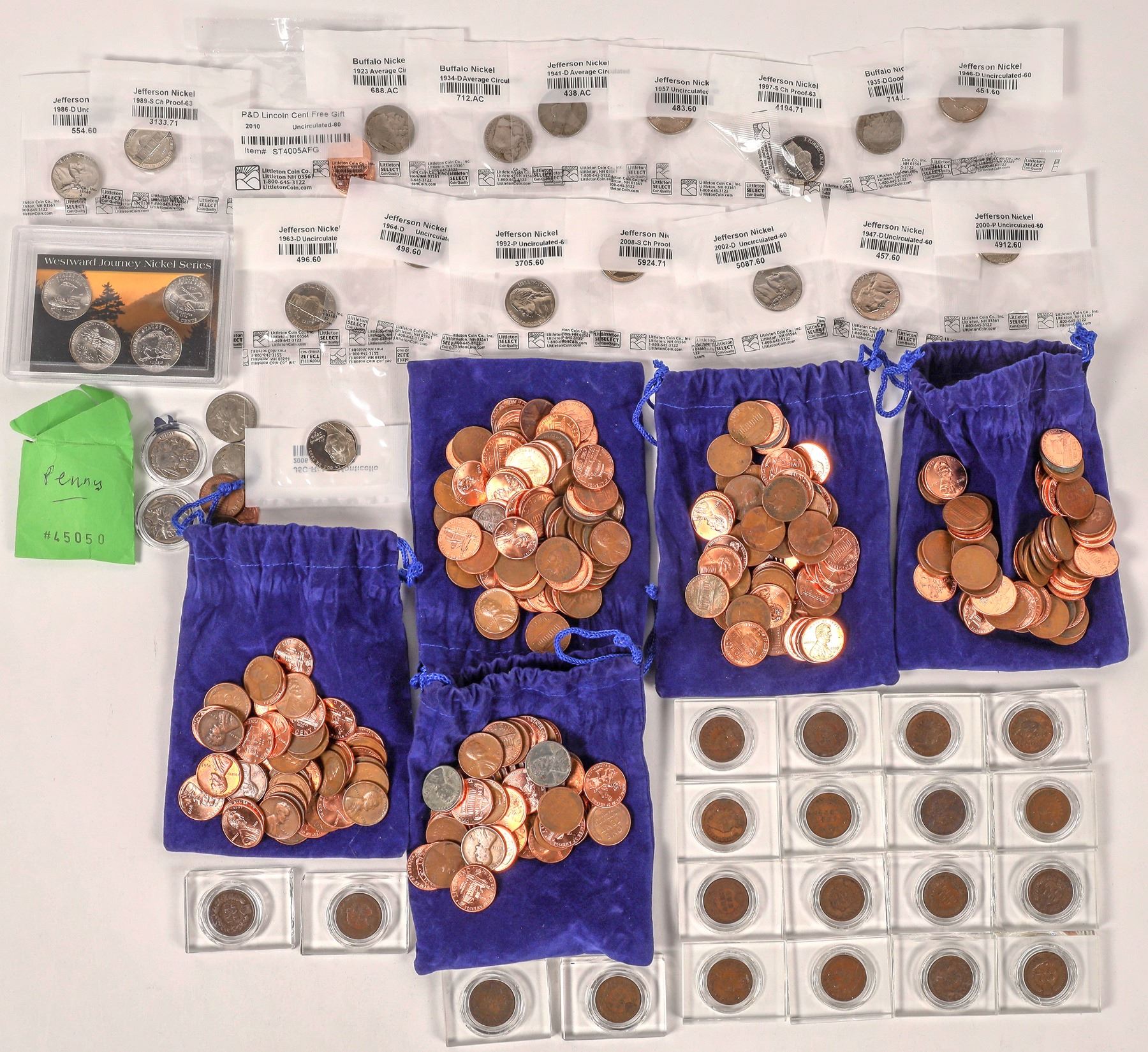 Twenty Indian Head pennies in clear plexiglass holders. Five blue velour bags each with about 100 pennies, a mix of Indian head, wheat back, steel cents and BU Lincoln commemoratives. About 20 Jefferson nickels, mostly uncirculated or proof. Seven Buffalo nickels "average circulated".