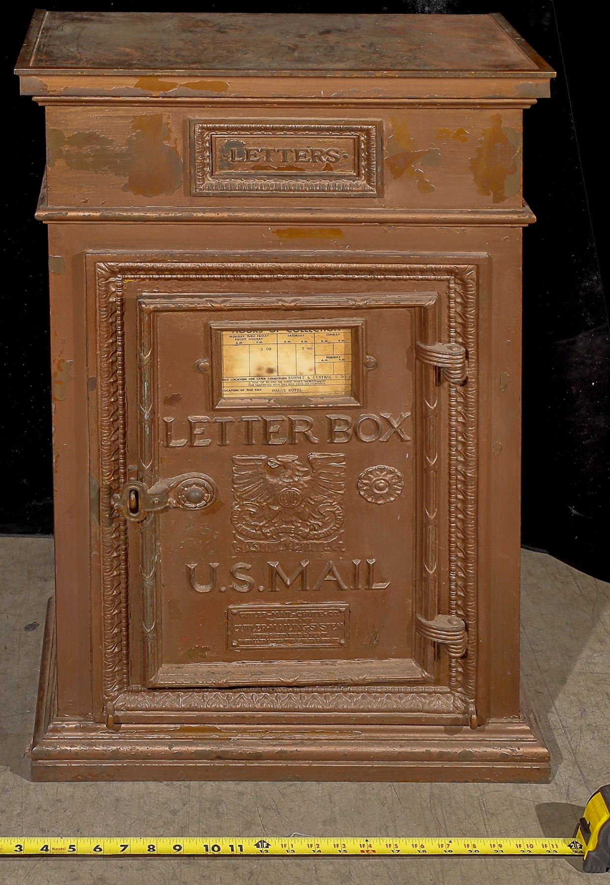 Brass and steel, street-side letter box for US Mail made by Cutler Mail Chute Company of Rochester, NY. Cutler Mailing System authorized by United States Post Office department. Installed under the Cutler patents. According to the paper label, it was last installed at the Osage Hotel, [Ponca City?], Oklahoma. 11 x 21 x 35 inches, c1905-1930.