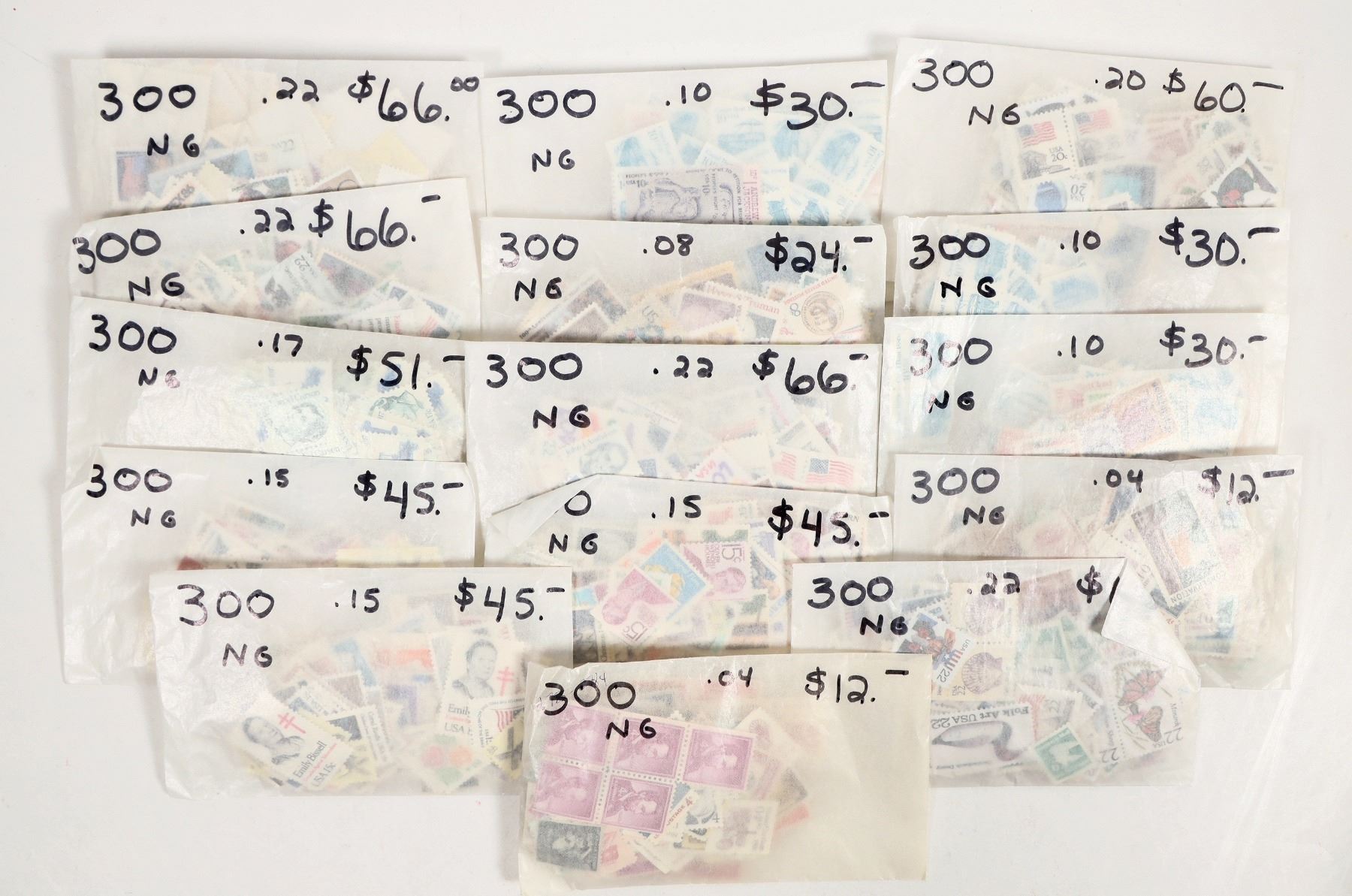 Lot of 14 packets. Each packet contains 300 uncancelled, mint current U.S. stamps. .04-.22 cent stamps. The value is $624.00. There is no gum and will need a glue stick.