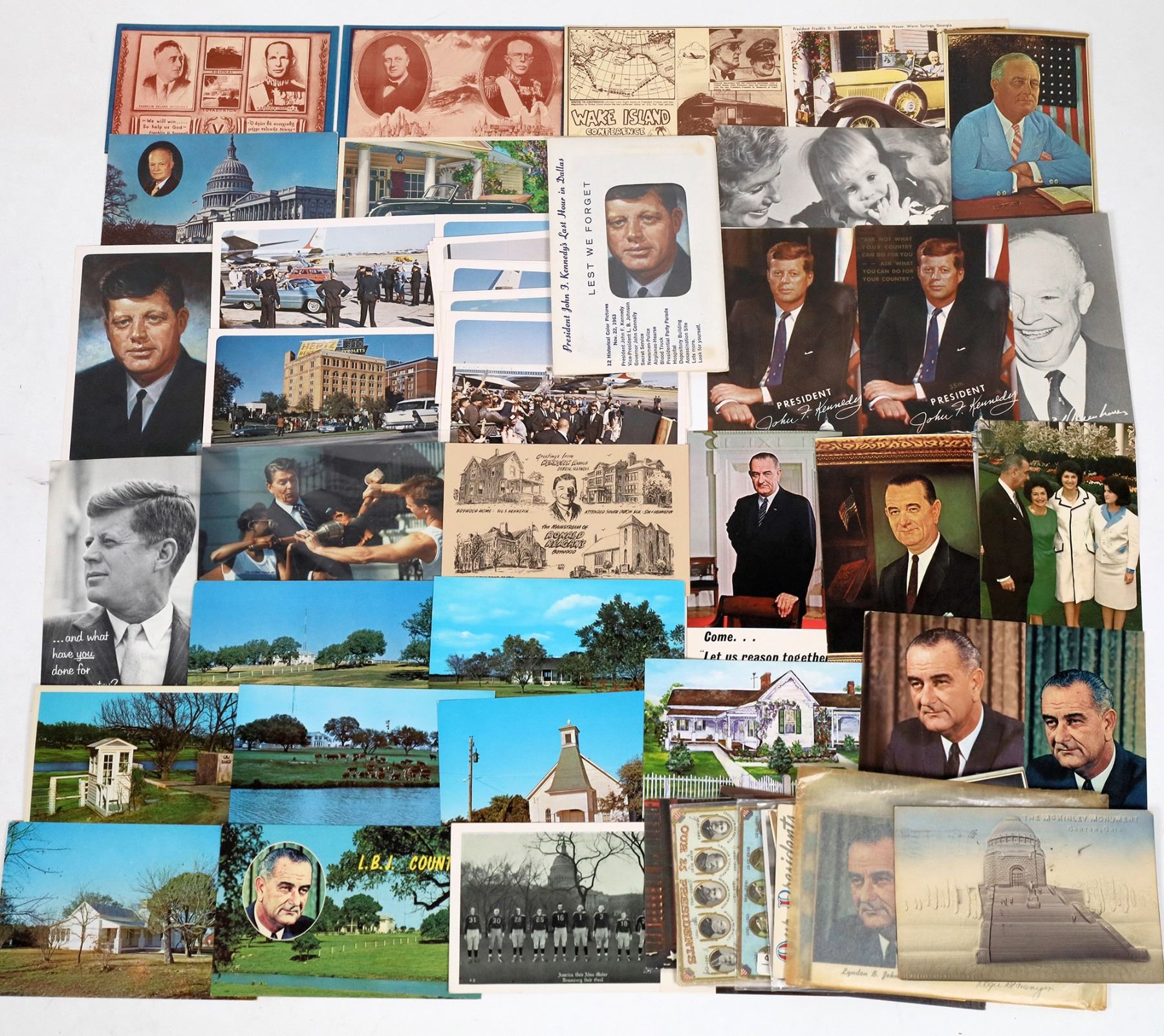 Approximately 66 postcards. Group includes many RPCs and lithos, some B/W, some color, two embossed which feature all presidents up to Theodore Roosevelt, some early 1900s, most unused, some used, with two canceled from 1907. Some presidents are Washington, Humphrey, Carter, Reagan, Johnson, John F. Kennedy, Eisenhower, and Franklin D. Roosevelt.