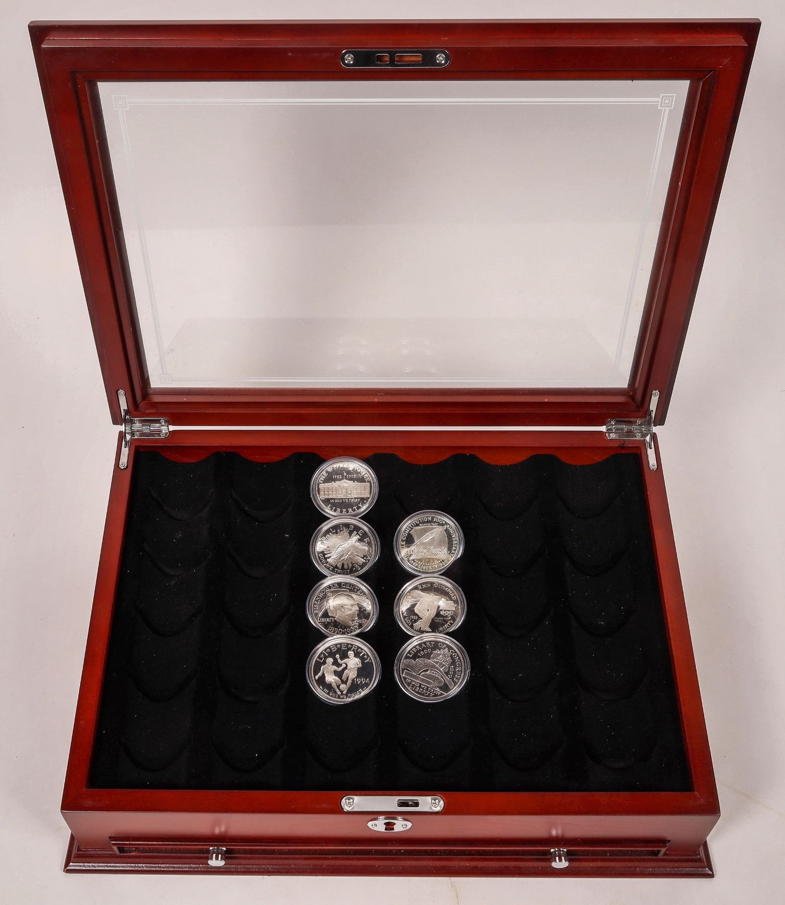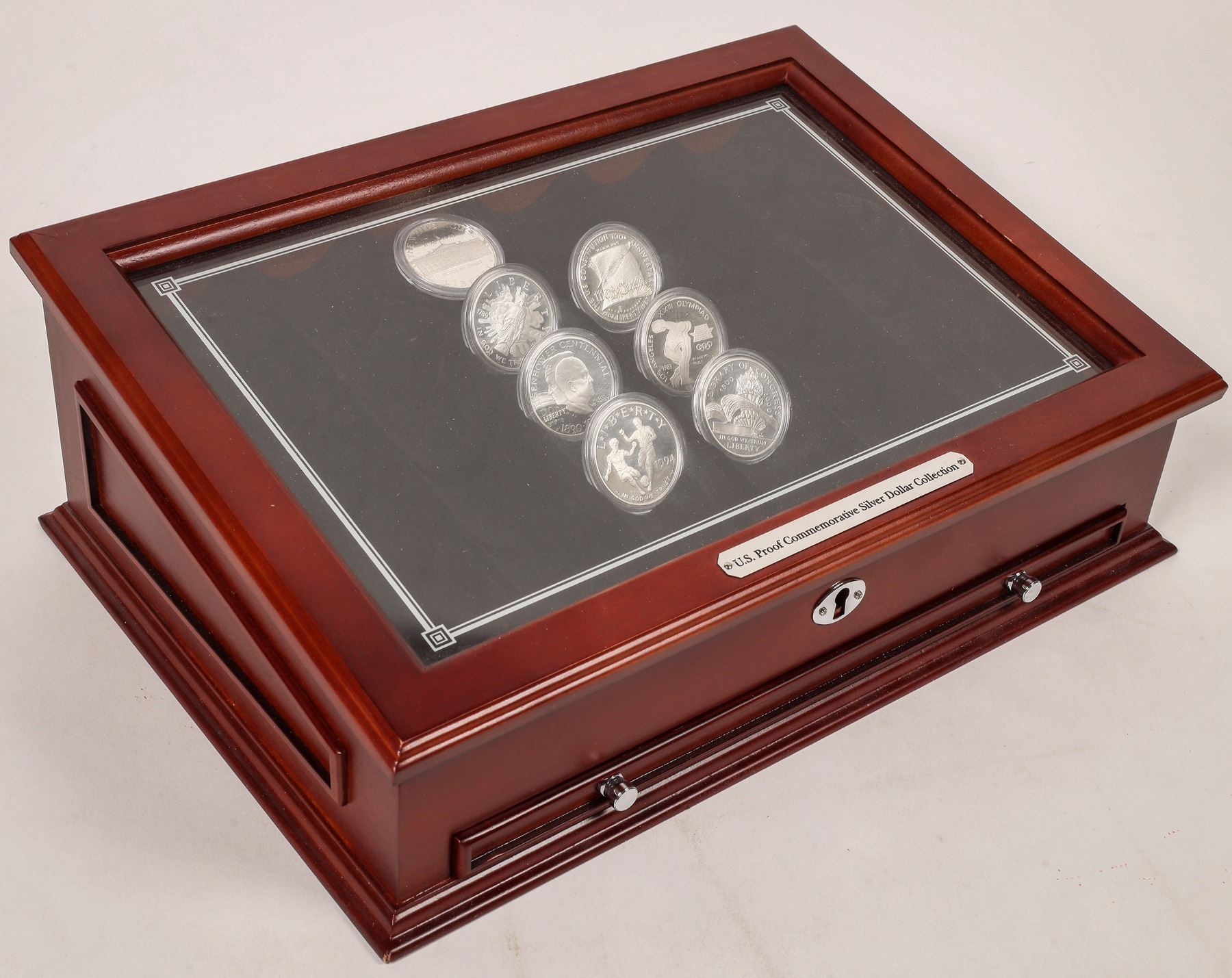 Issued by PCS Stamps and Coins, a glass topped display case (15 x 11 x 6 inches) with seven commemorative silver dollars with room for dozens more. Included are: 1983 L.A. Olympics; 1987 U. S. Constitution; 1989 Statue of Liberty; 1990 Eisenhower Centennial; 1992 The White House; 1994 World Cup; 2000 Library of Congress.