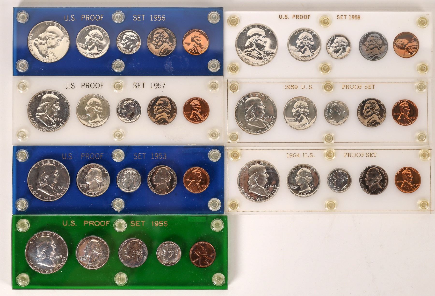 Seven U. S. five coin proof sets 1953-1959, housed in Capital Plastics cases. Four have velour cases. Coins are unblemished.