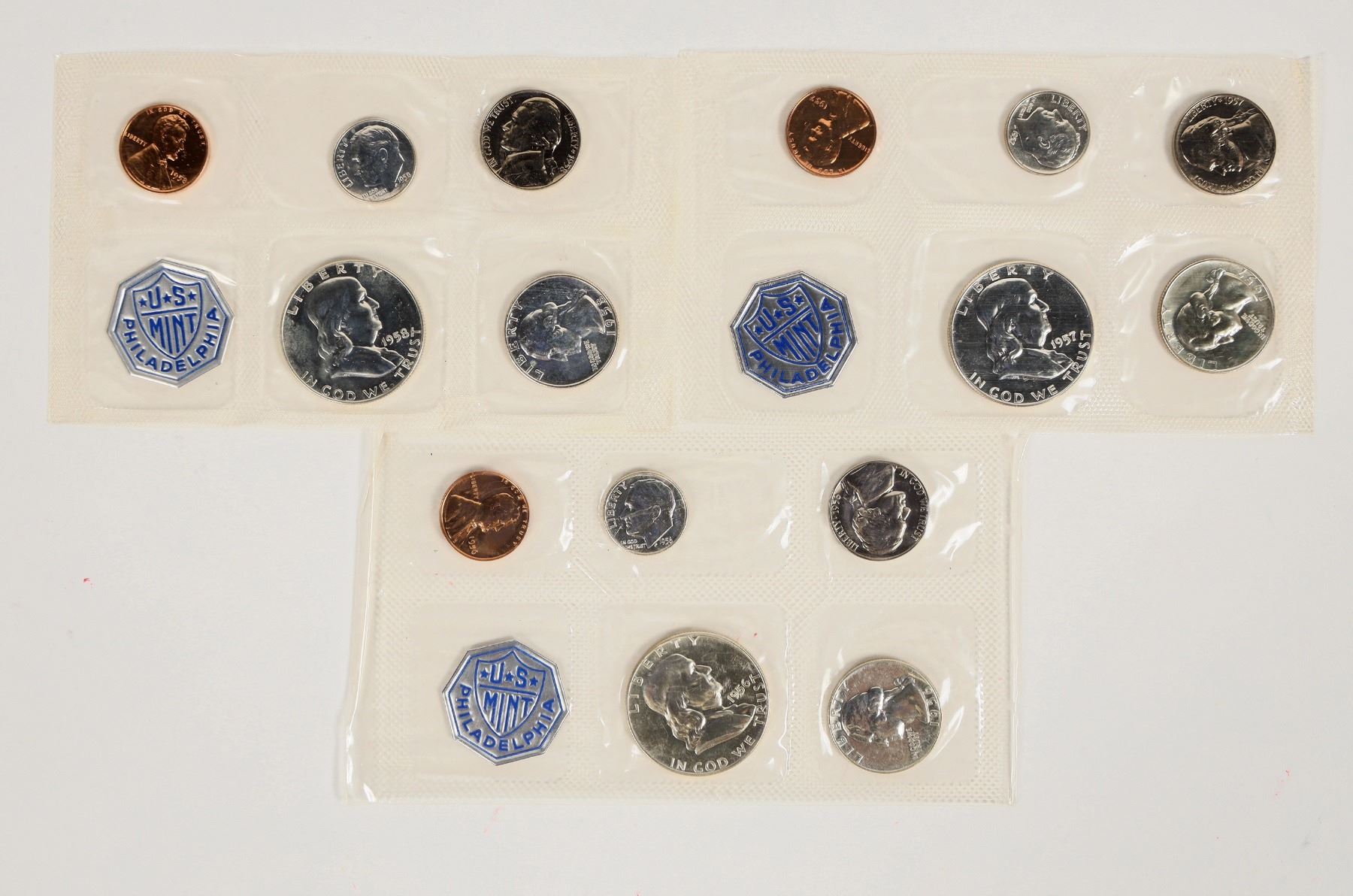 Three U. S. Proof sets in original Treasury Department envelopes and sealed plastic packaging: 1956, 1957, 1958. Excellent coins!