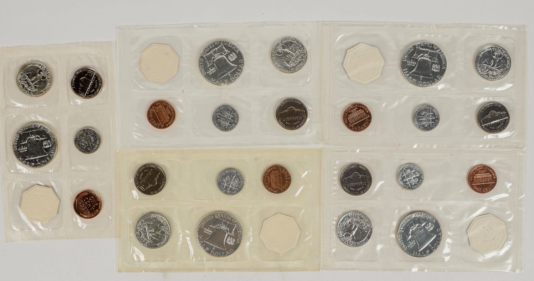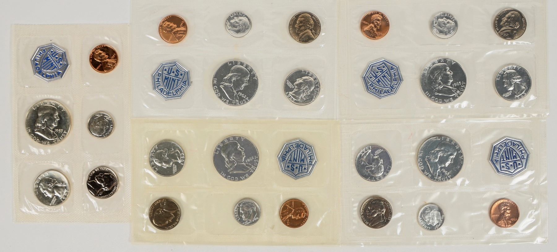Three U. S. proof sets in original Treasury Department envelopes: 1957, 1962 (10 coins); 1963 (10 coins).