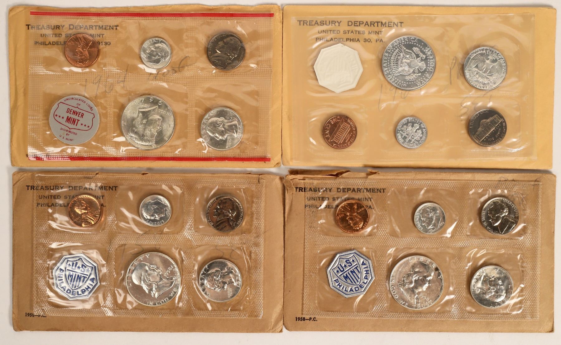 Lot of four U. S. Proof Sets: two 1958 (mintage 875,652); and two 1964 (mintage 3,950,762). All in original envelopes.