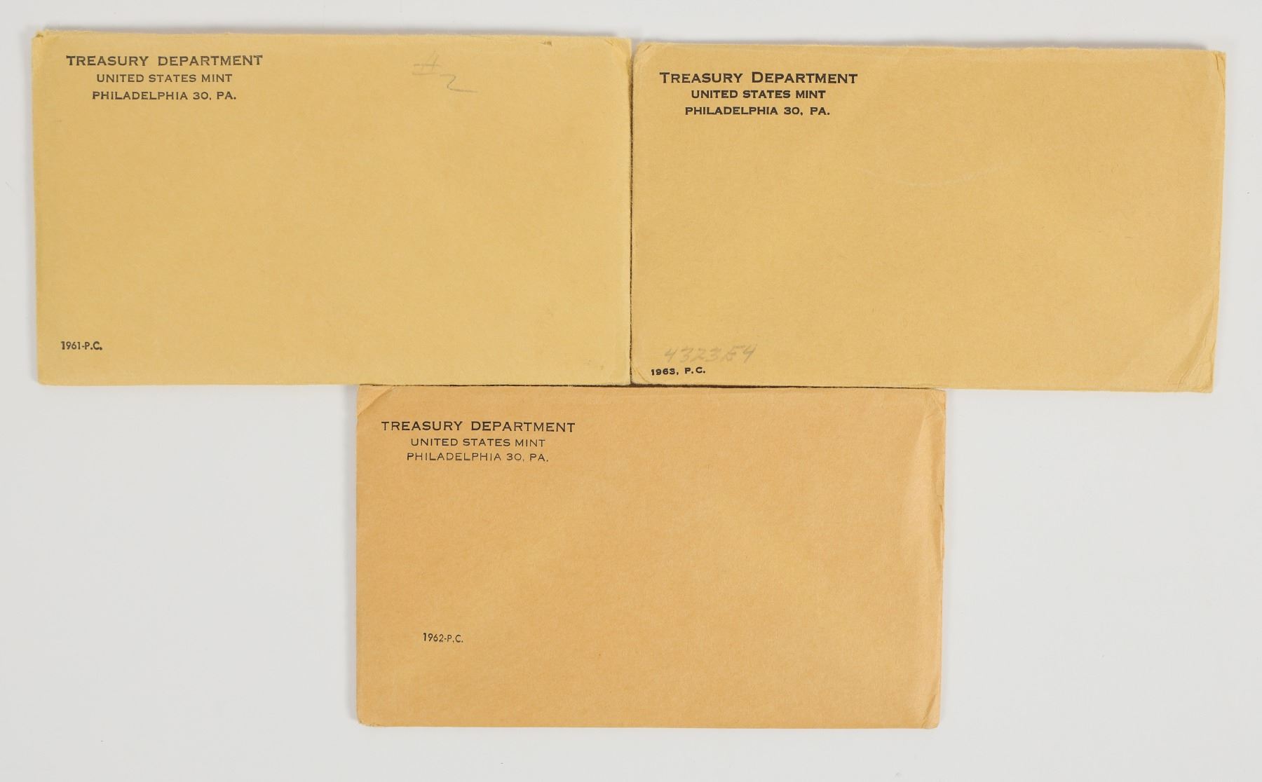 Three U. S. Proof sets in original Treasury Department envelopes and sealed plastic packaging. Envelopes are still sealed: 1961, 1962, 1963.