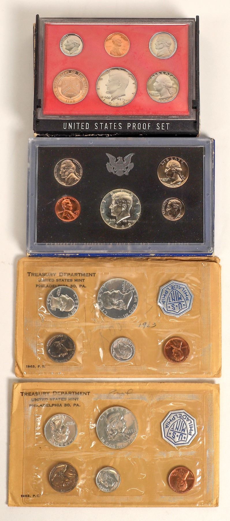 Lot of four U. S. Proof Sets in original packaging: two 1963 (mintage 3,075,645); 1969, (mintage 2,934,631); 1982 (mintage 3,857,479). All five coin sets.