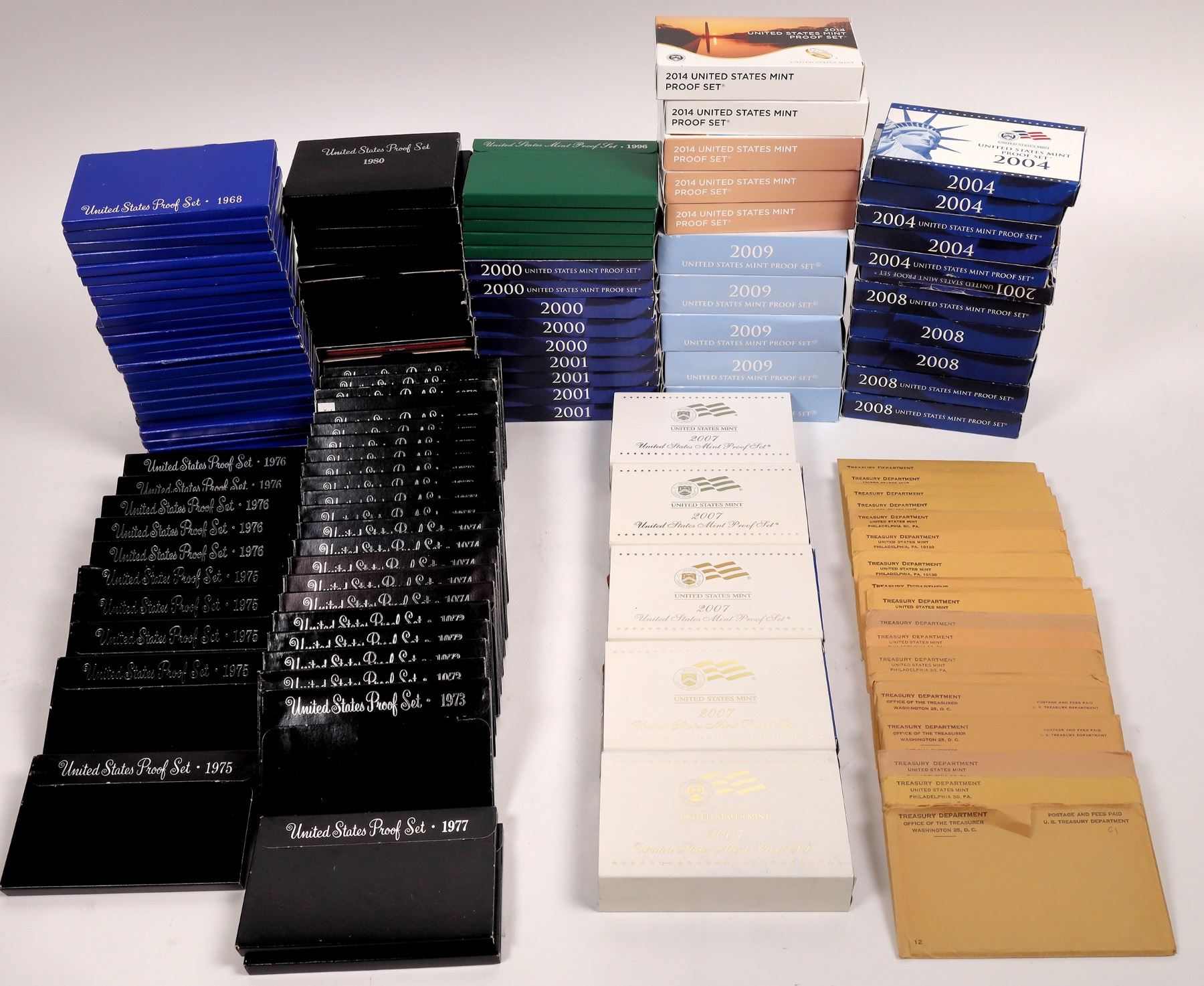 Bankers box of 134 proof sets: five for each year (except 1962 which has four--whoops): 1961,1962,1963,1964, 1968,1969, 1970, 1971, 1972, 1973, 1974, 1975, 1976, 1977, 1978, 1979, 1980, 1981, 1982, 1996, 2000, 2001, 2004, 2007, 2008, 2009, 2014.
